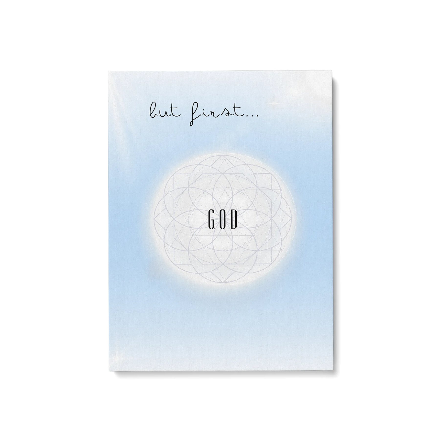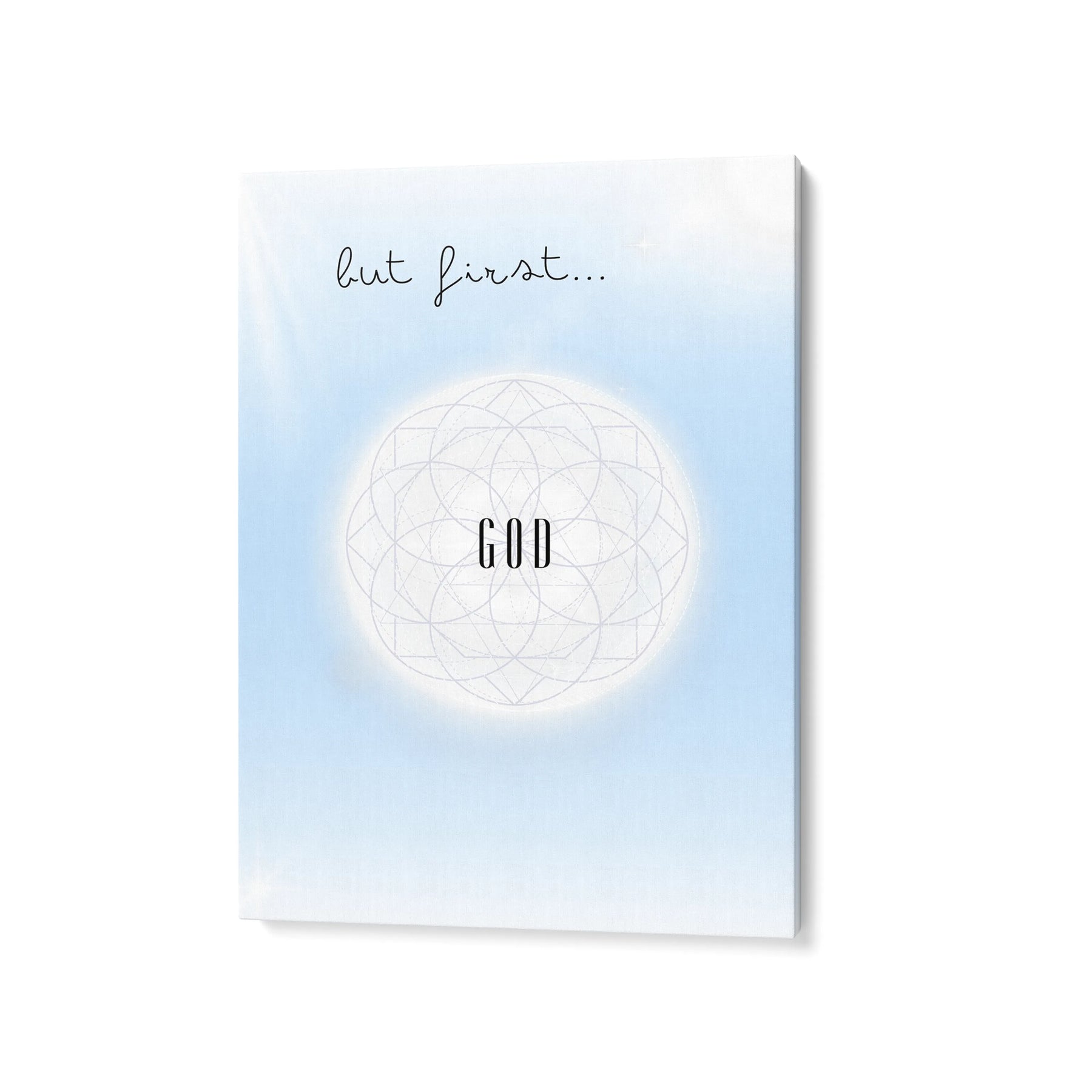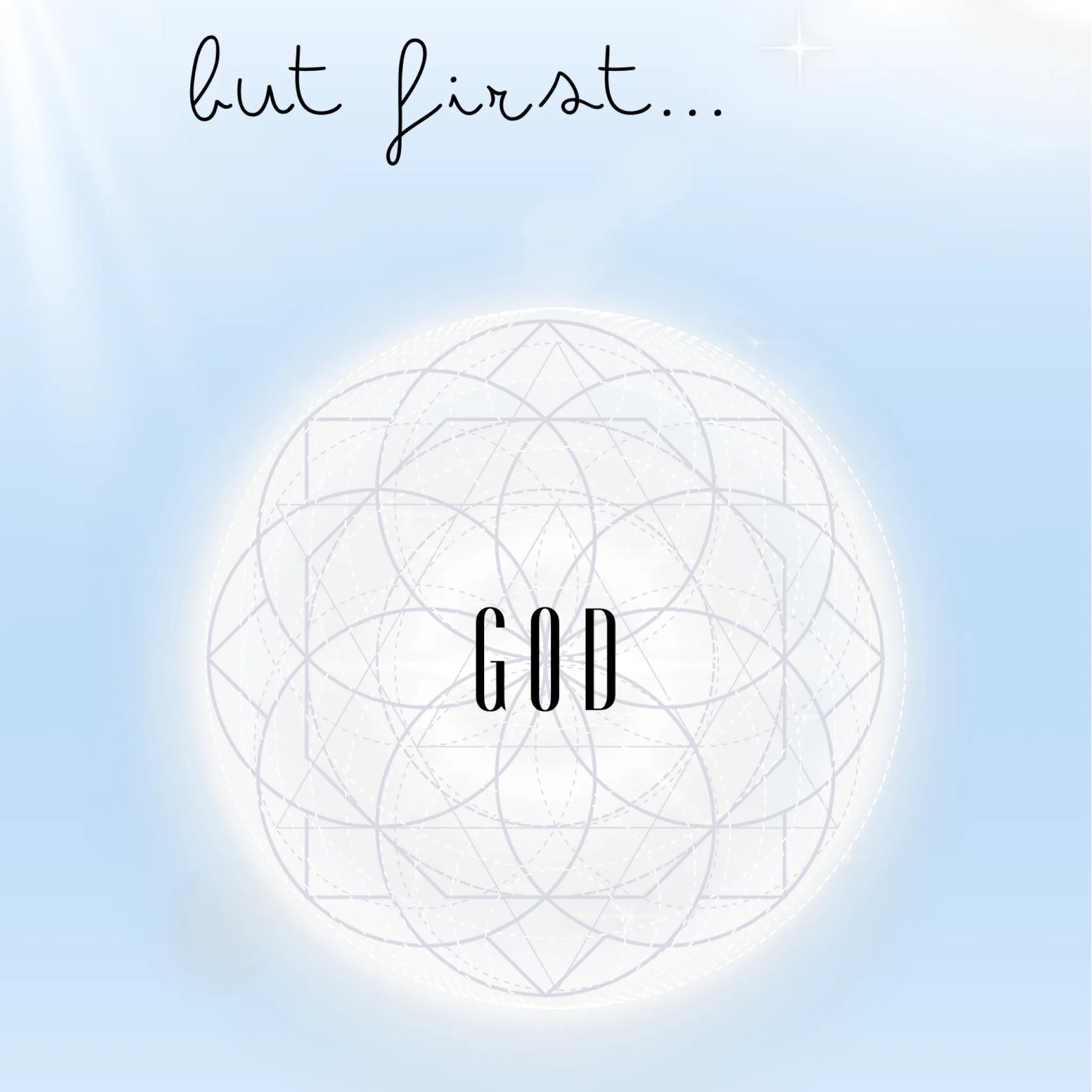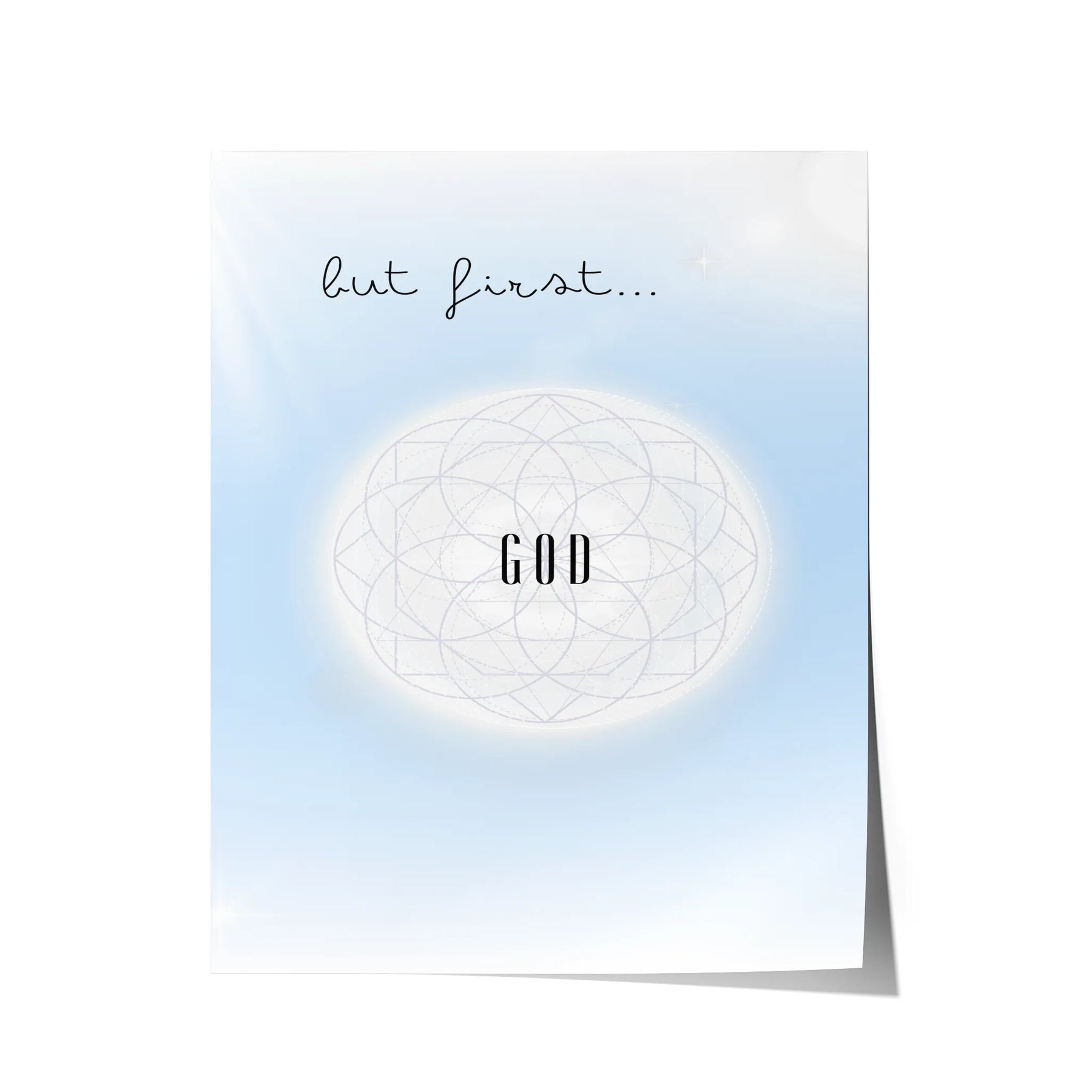 „But First… God“ verbindet schlichte Worte mit einer sanften, himmelsgleichen Bildsprache. Auf einem strahlend hellen Hintergrund öffnet sich ein feines geometrisches Muster, das an Harmonie, Ursprung und innere Ausrichtung erinnert. Die zarte Typografie schwebt leicht über dem Lichtkreis und verleiht dem Motiv eine ruhige, klare Präsenz.