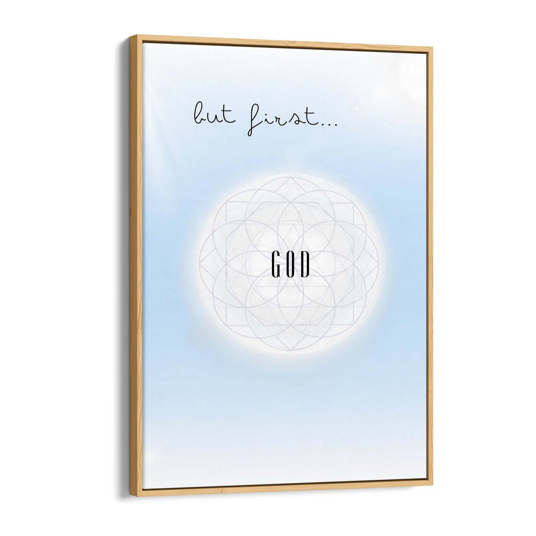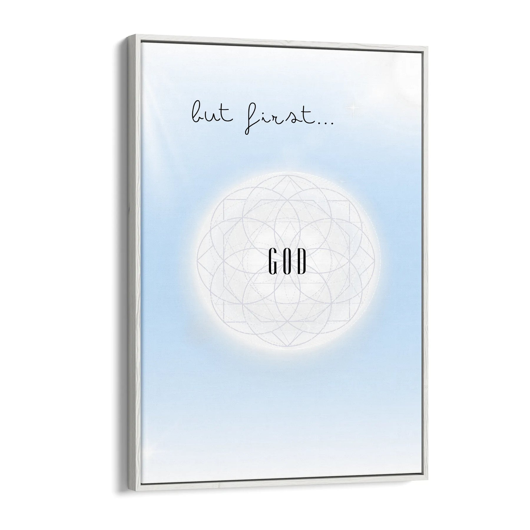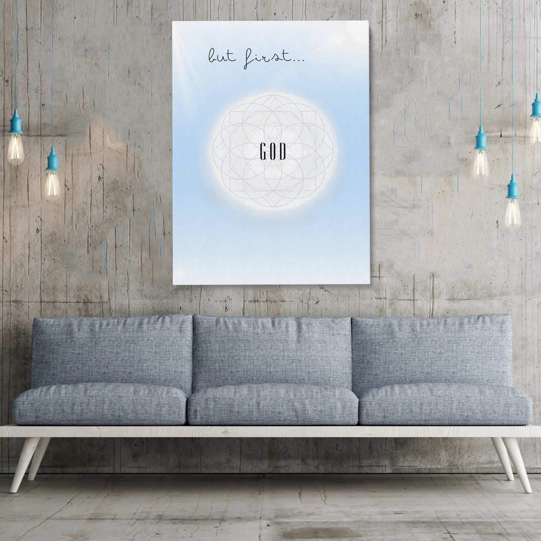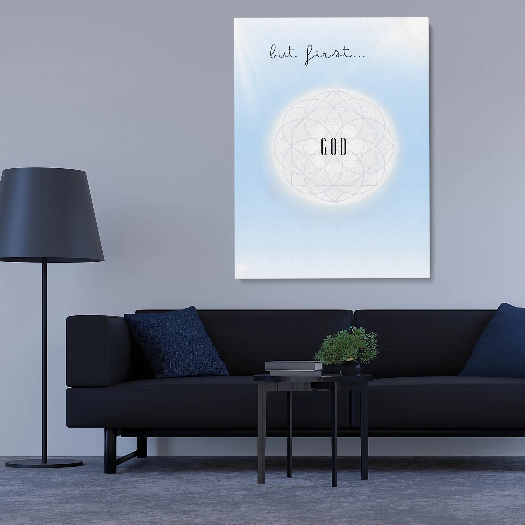 „But First… God“ verbindet schlichte Worte mit einer sanften, himmelsgleichen Bildsprache. Auf einem strahlend hellen Hintergrund öffnet sich ein feines geometrisches Muster, das an Harmonie, Ursprung und innere Ausrichtung erinnert. Die zarte Typografie schwebt leicht über dem Lichtkreis und verleiht dem Motiv eine ruhige, klare Präsenz.