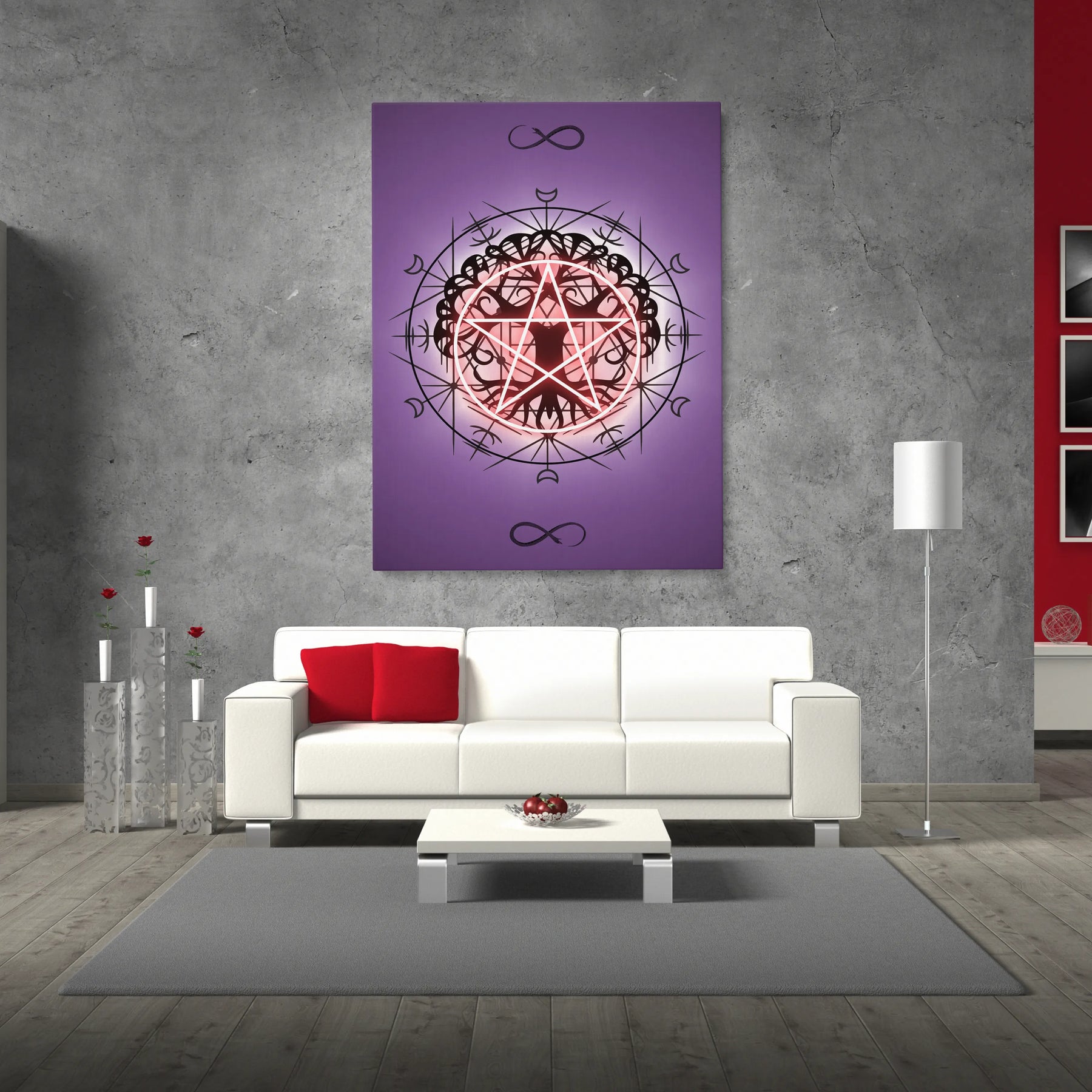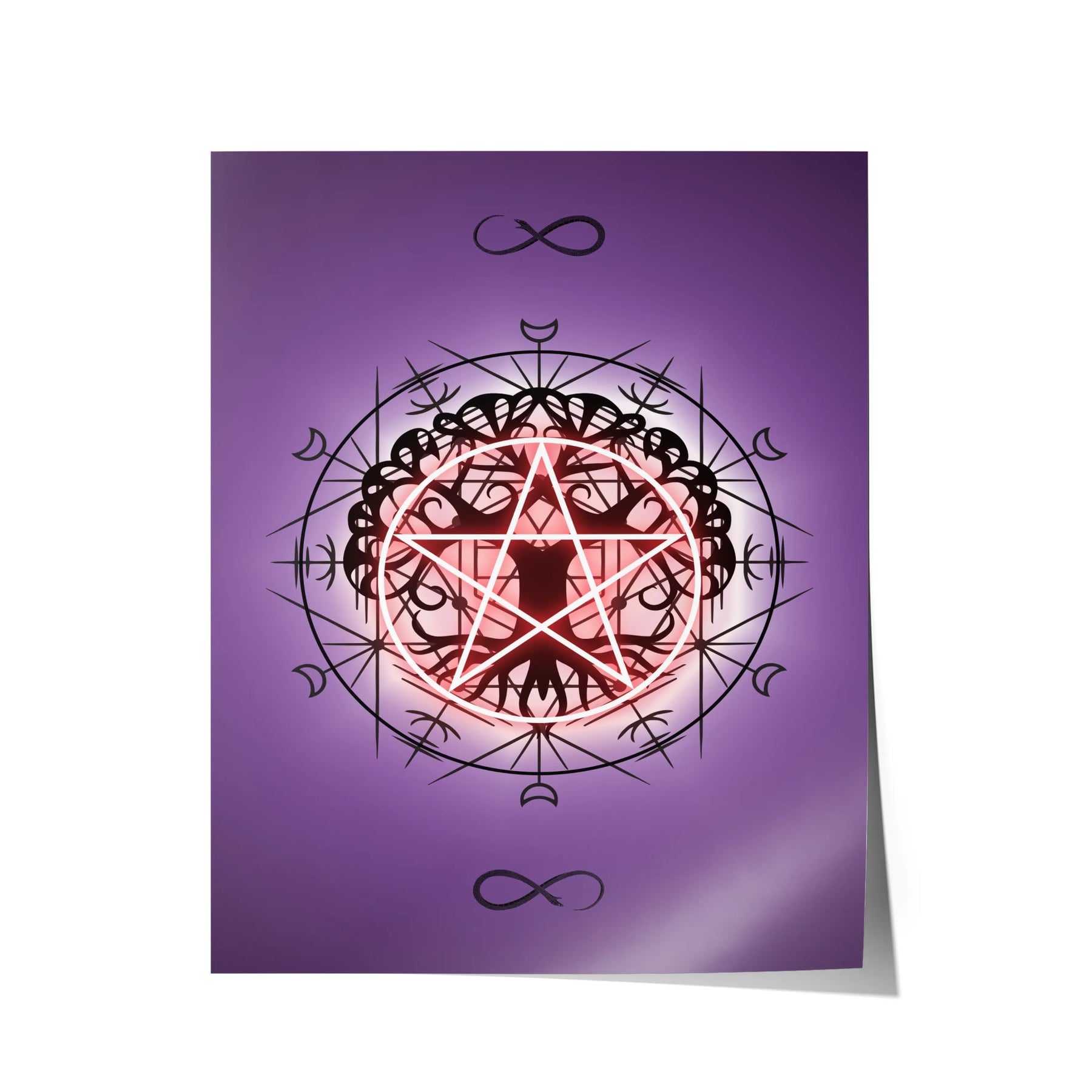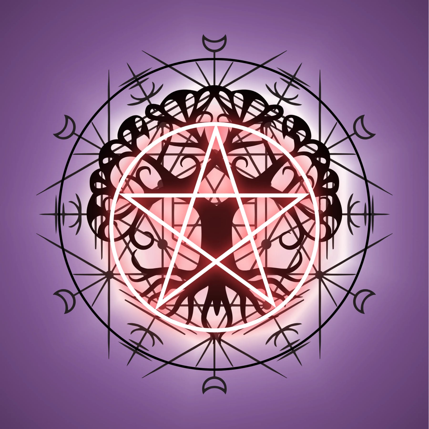 „Equilibrium“ zeigt das Pentagramm als ein konzentriertes Kraftfeld, das wie ein magisches Siegel wirkt. Die klare Geometrie im Zentrum erinnert an ein altes Schutzzeichen, in dem die fünf Elemente – Erde, Wasser, Feuer, Luft und Geist – gebunden und in ihrem natürlichen Verhältnis gehalten werden. Der nach unten wachsende Lebensbaum verweist darauf, dass Stabilität ihren Ursprung in der Tiefe hat; die Mondsicheln darüber erinnern an Wandel und daran, dass Balance ein dynamischer Zustand ist, der sich immer wieder neu formt.