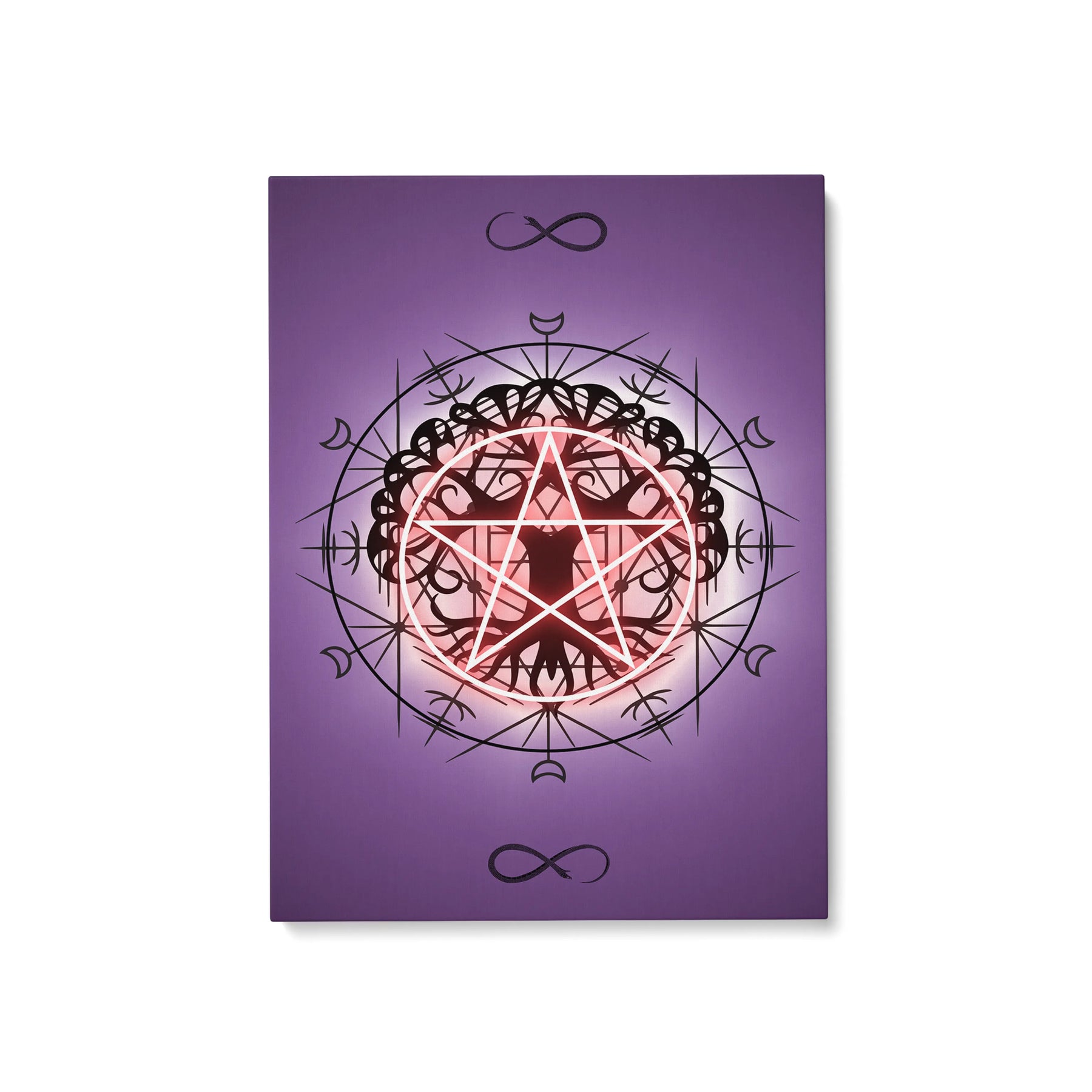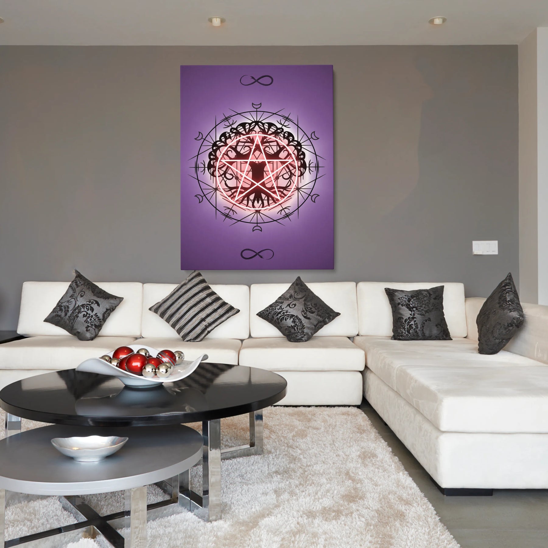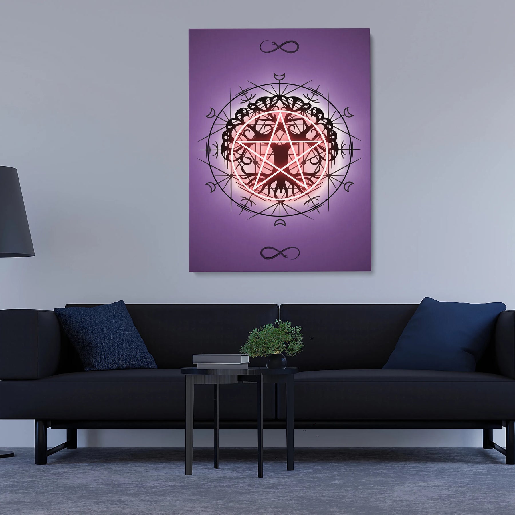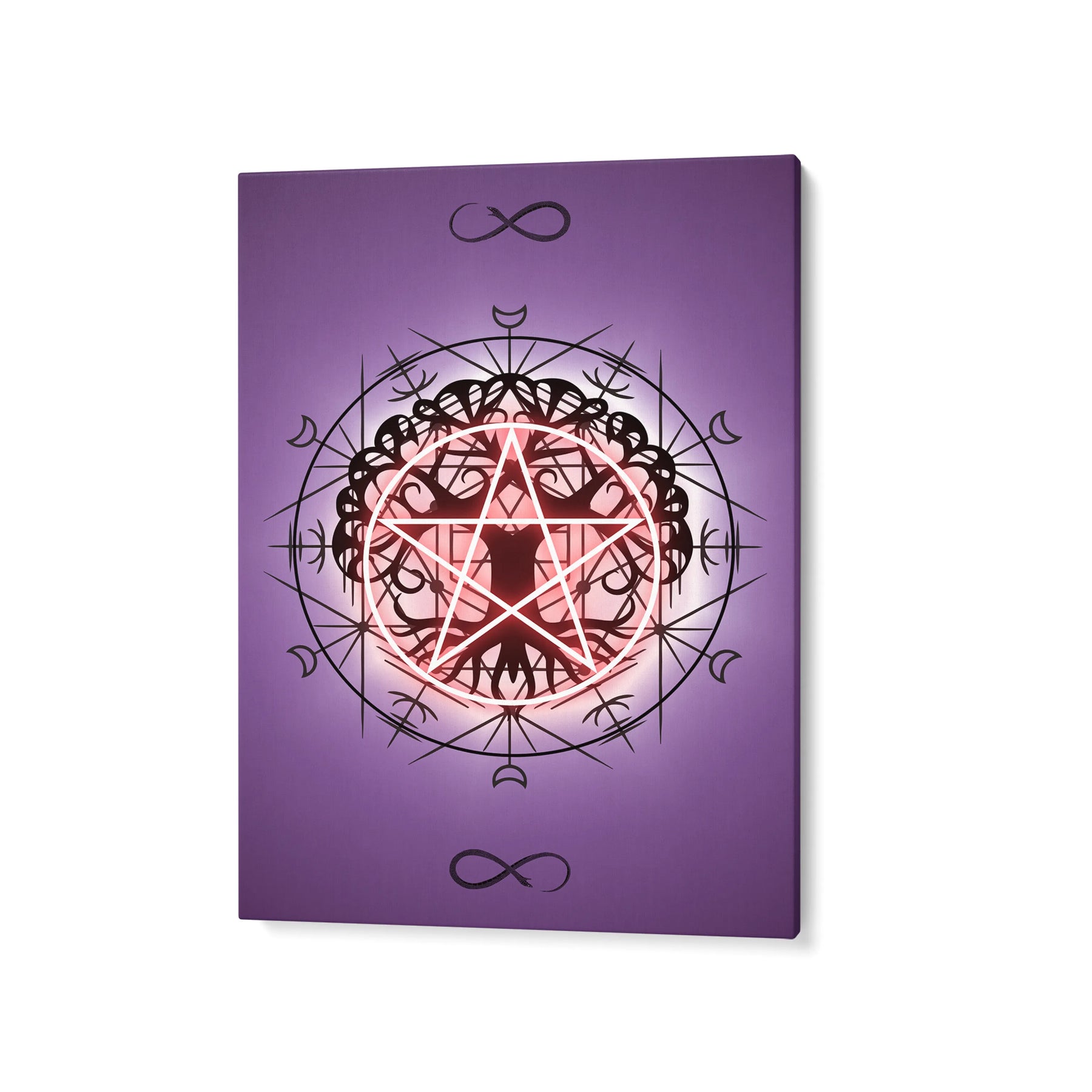 „Equilibrium“ zeigt das Pentagramm als ein konzentriertes Kraftfeld, das wie ein magisches Siegel wirkt. Die klare Geometrie im Zentrum erinnert an ein altes Schutzzeichen, in dem die fünf Elemente – Erde, Wasser, Feuer, Luft und Geist – gebunden und in ihrem natürlichen Verhältnis gehalten werden. Der nach unten wachsende Lebensbaum verweist darauf, dass Stabilität ihren Ursprung in der Tiefe hat; die Mondsicheln darüber erinnern an Wandel und daran, dass Balance ein dynamischer Zustand ist, der sich immer wieder neu formt.