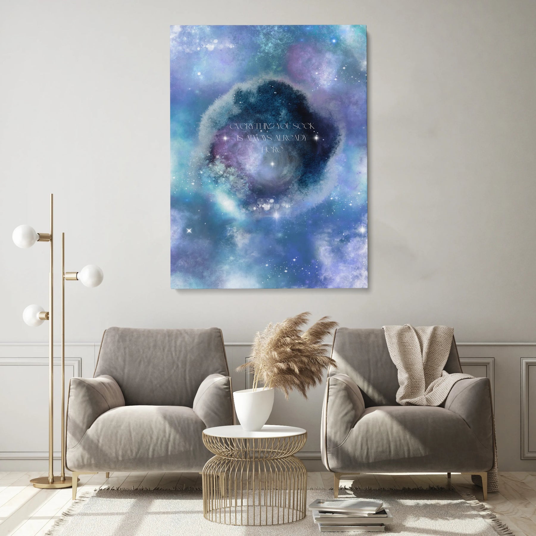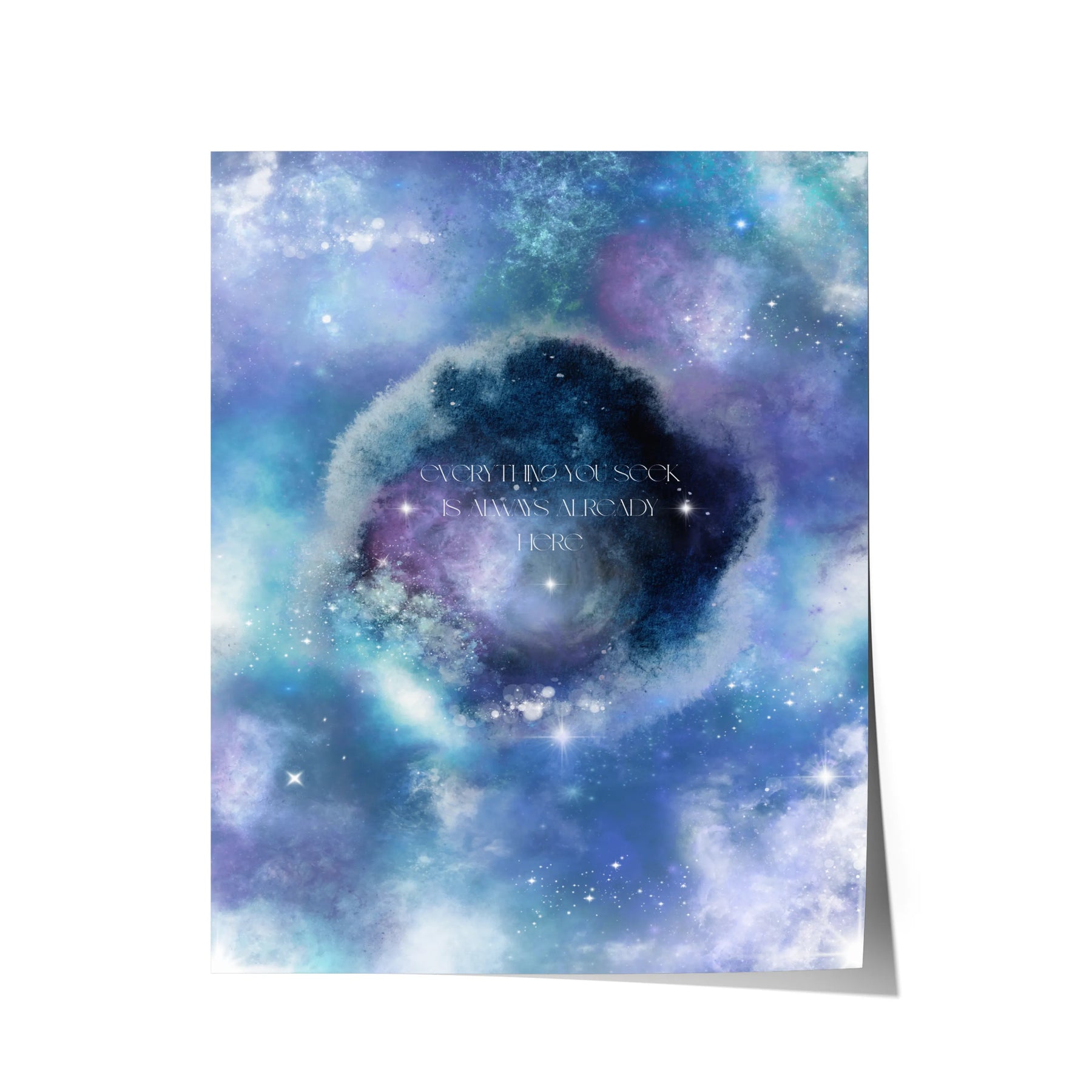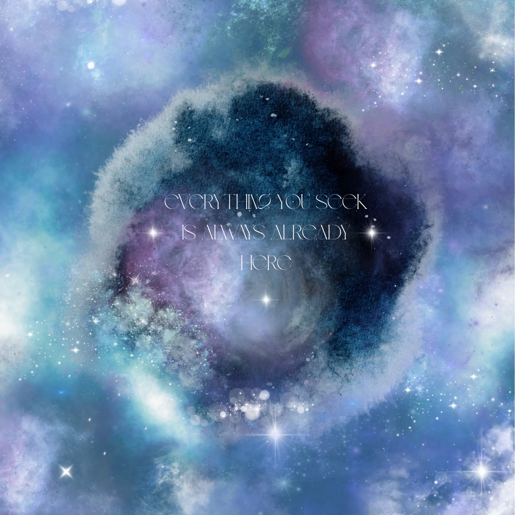 „Seeker“ öffnet einen stillen, weiten Raum – ein Kosmos aus sanften Nebeln, funkelnden Sternfeldern und einem tiefen, schimmernden Zentrum, das wie ein Portal ins eigene Sein wirkt. Die Farben fließen in Nuancen von Blau, Lila, Türkis und silbrigem Weiß ineinander und erzeugen eine Atmosphäre von ruhiger Unendlichkeit. Inmitten dieser kosmischen Weite erscheint der Satz: "Everything you seek is always already here." Das Bild wirkt wie ein stiller Hinweis darauf, dass alles, wonach man sucht, nicht im Außen liegt, sondern im gegenwärtigen Moment bereits in einem ruht.