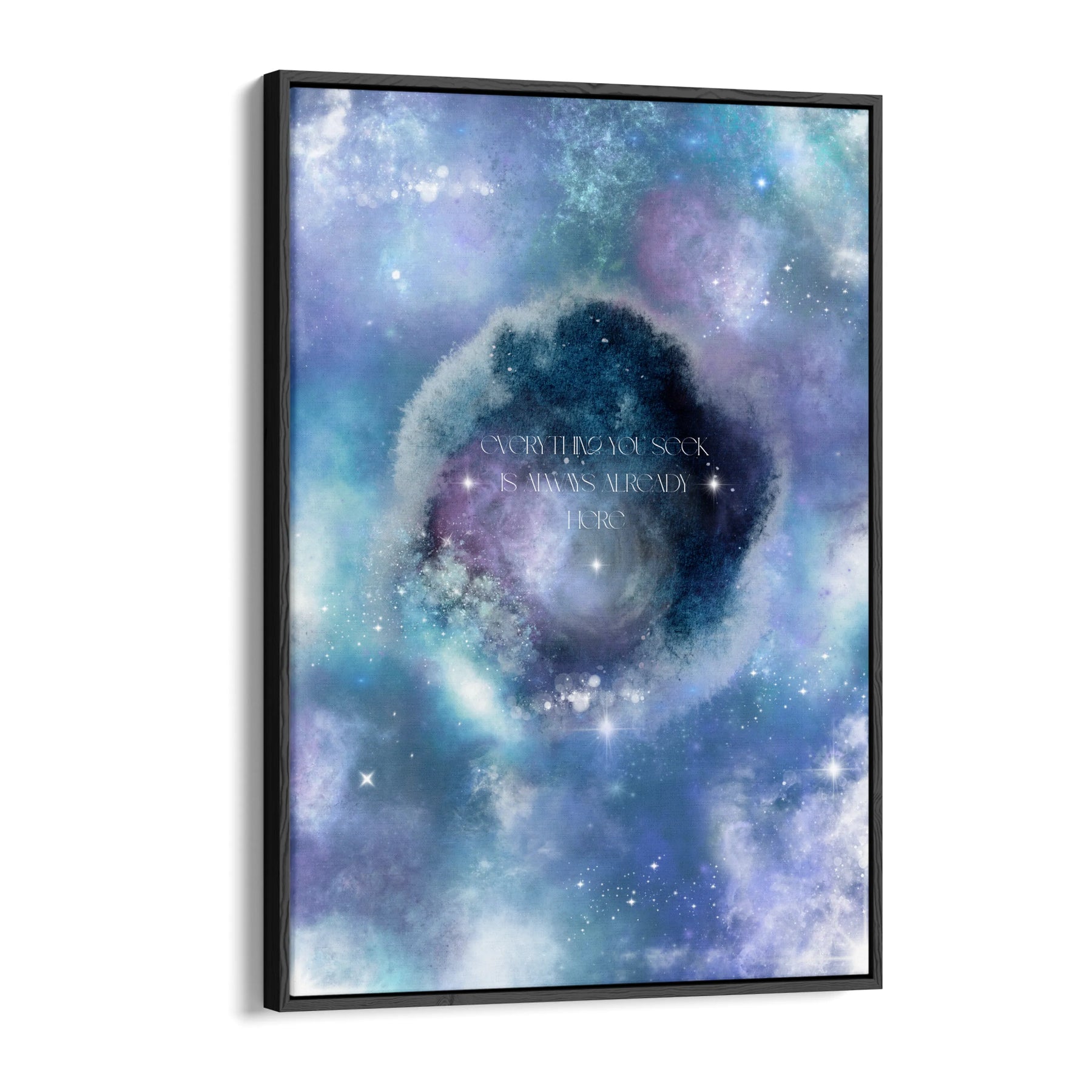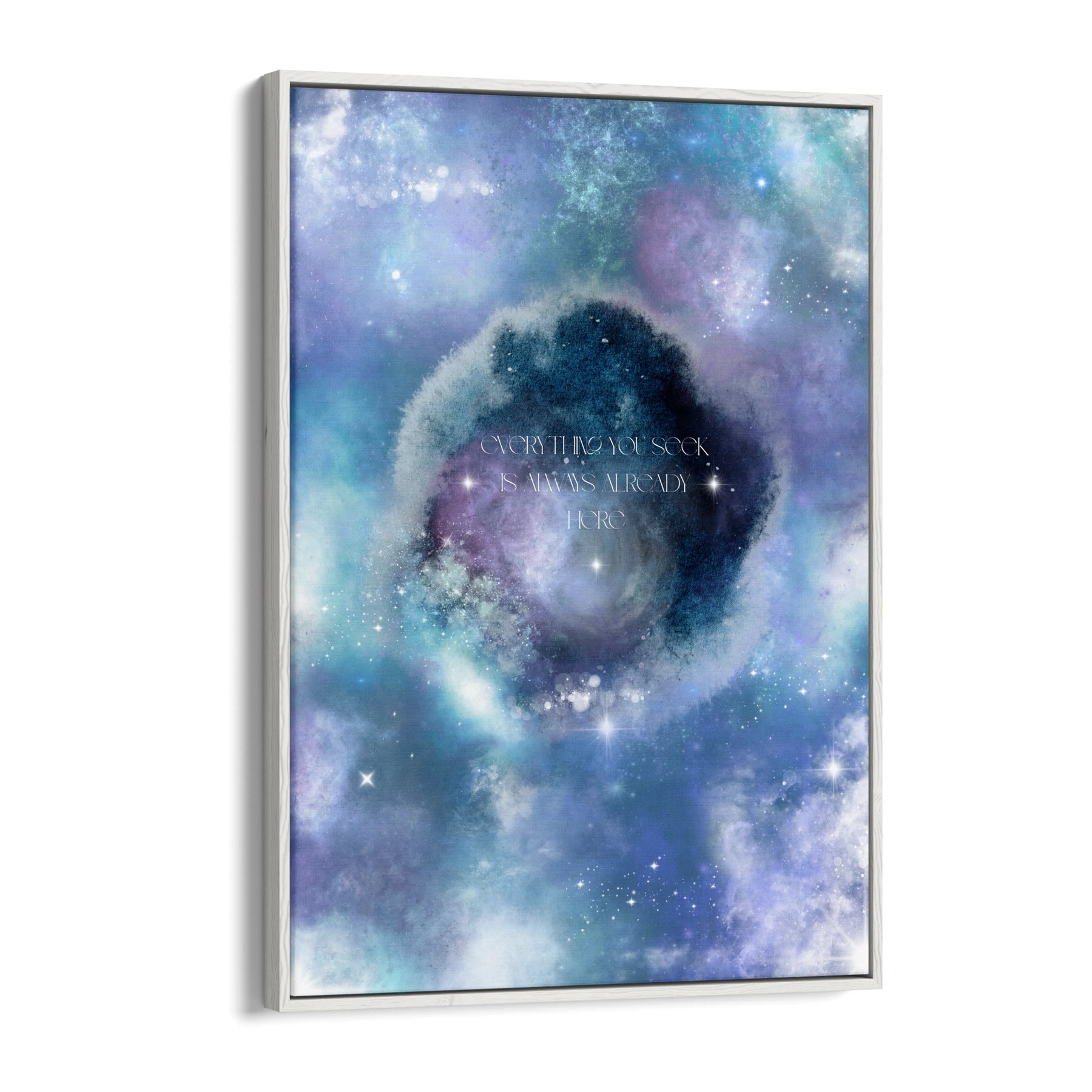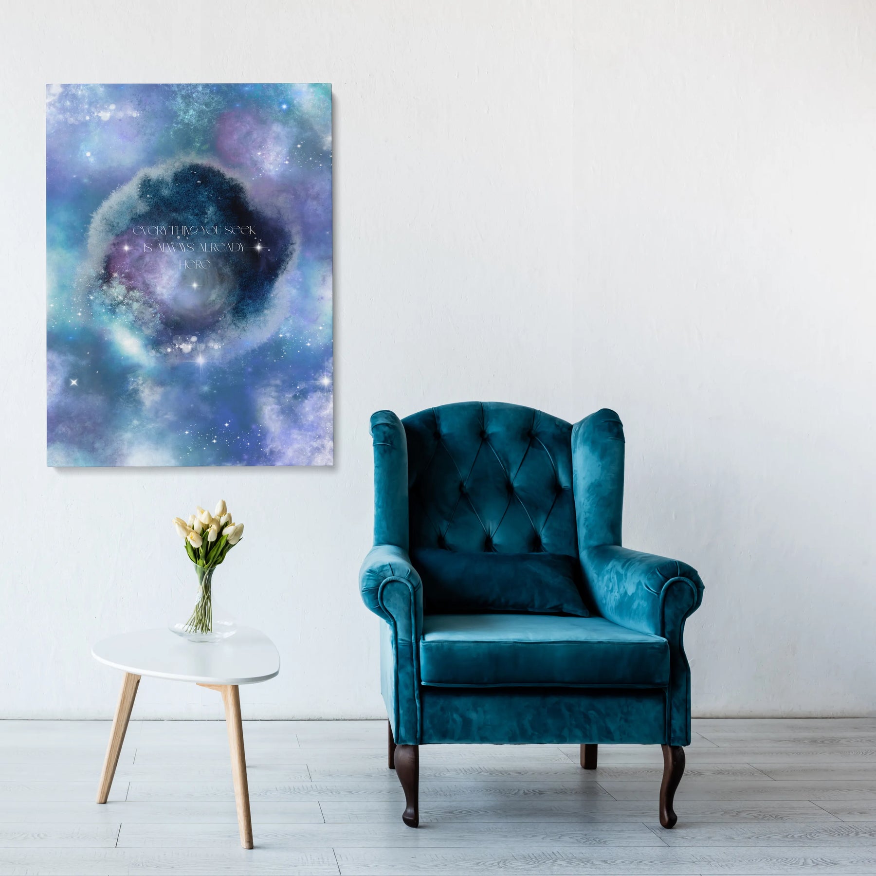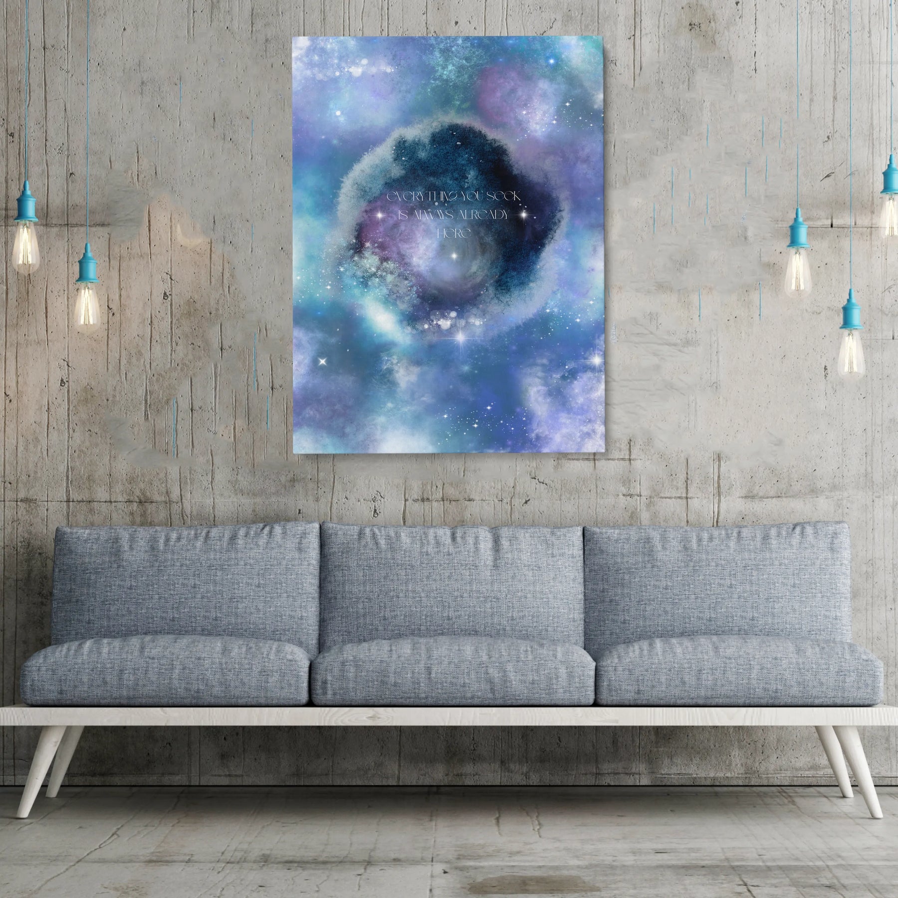 „Seeker“ öffnet einen stillen, weiten Raum – ein Kosmos aus sanften Nebeln, funkelnden Sternfeldern und einem tiefen, schimmernden Zentrum, das wie ein Portal ins eigene Sein wirkt. Die Farben fließen in Nuancen von Blau, Lila, Türkis und silbrigem Weiß ineinander und erzeugen eine Atmosphäre von ruhiger Unendlichkeit. Inmitten dieser kosmischen Weite erscheint der Satz: "Everything you seek is always already here." Das Bild wirkt wie ein stiller Hinweis darauf, dass alles, wonach man sucht, nicht im Außen liegt, sondern im gegenwärtigen Moment bereits in einem ruht.