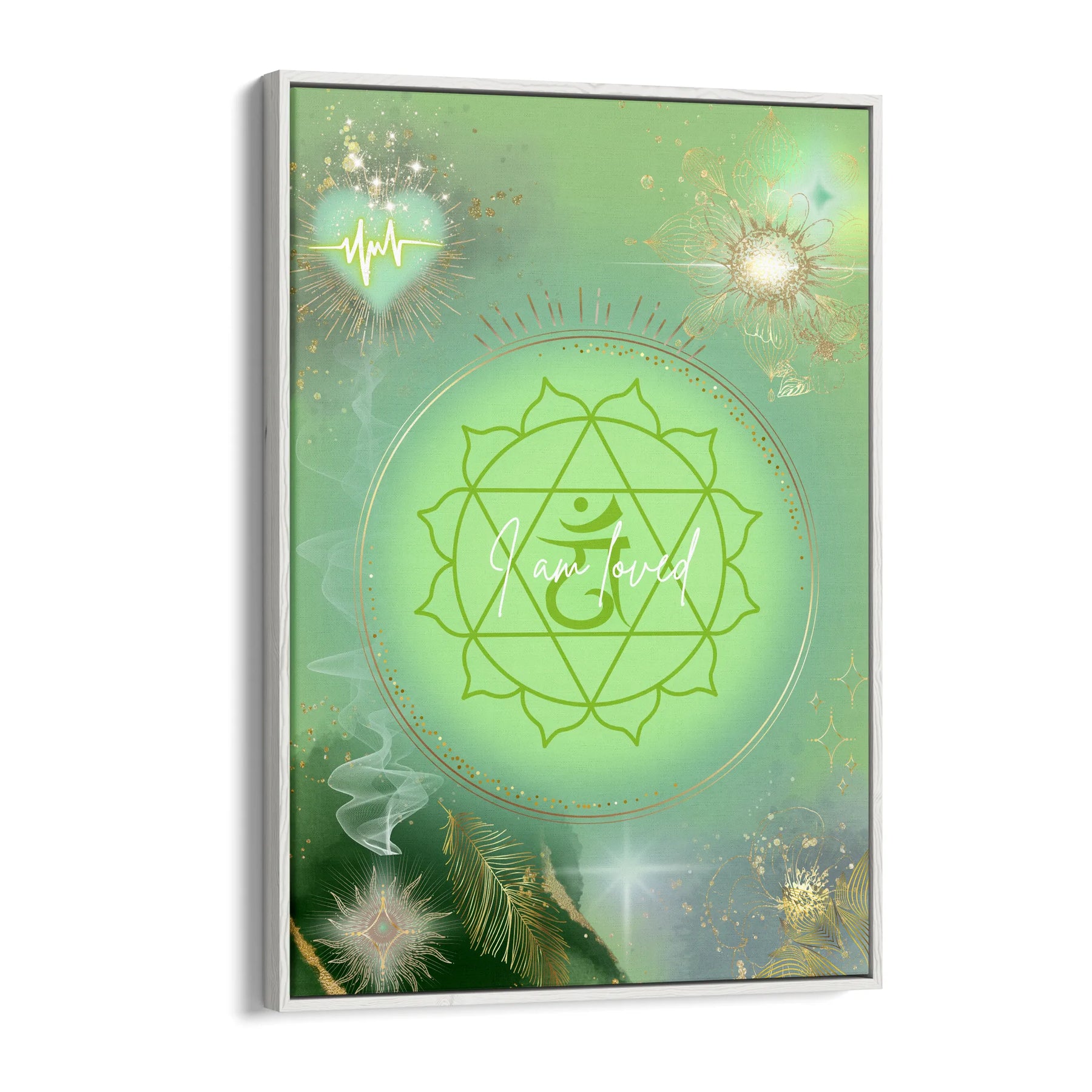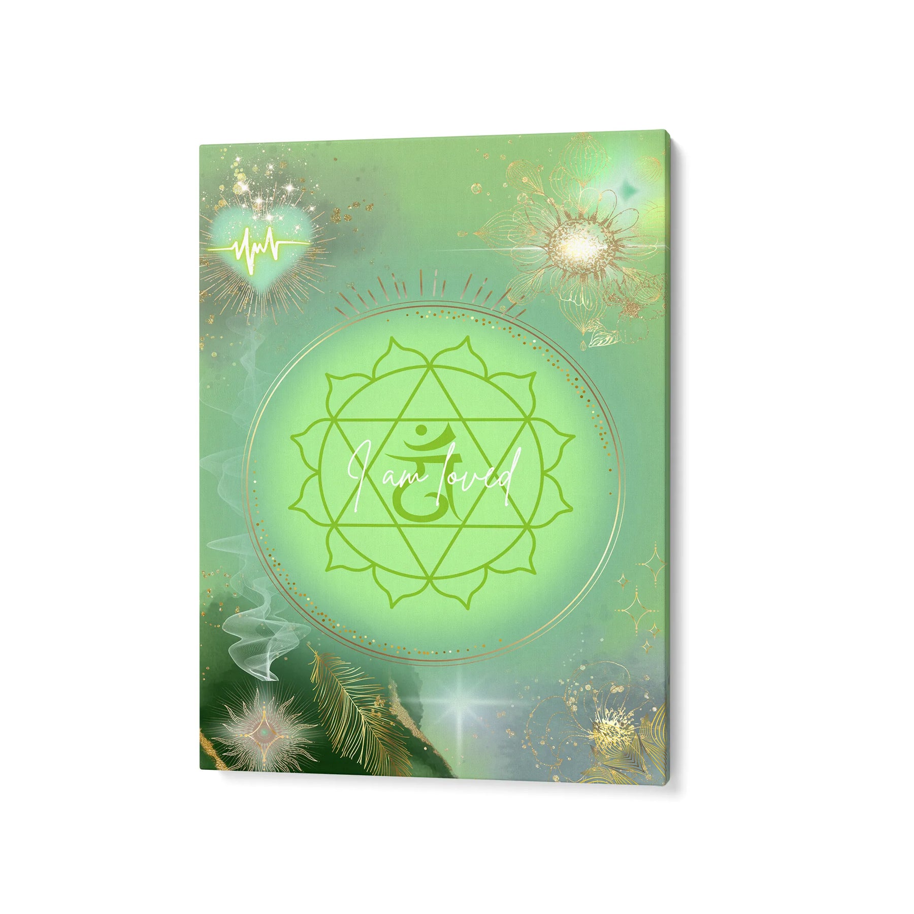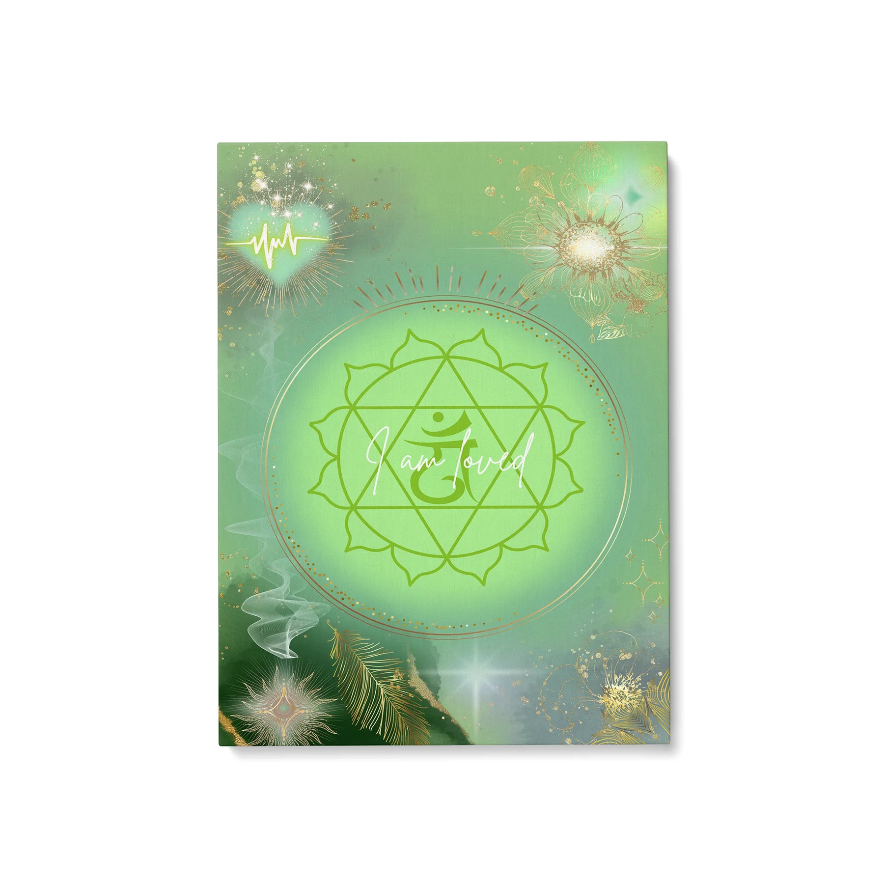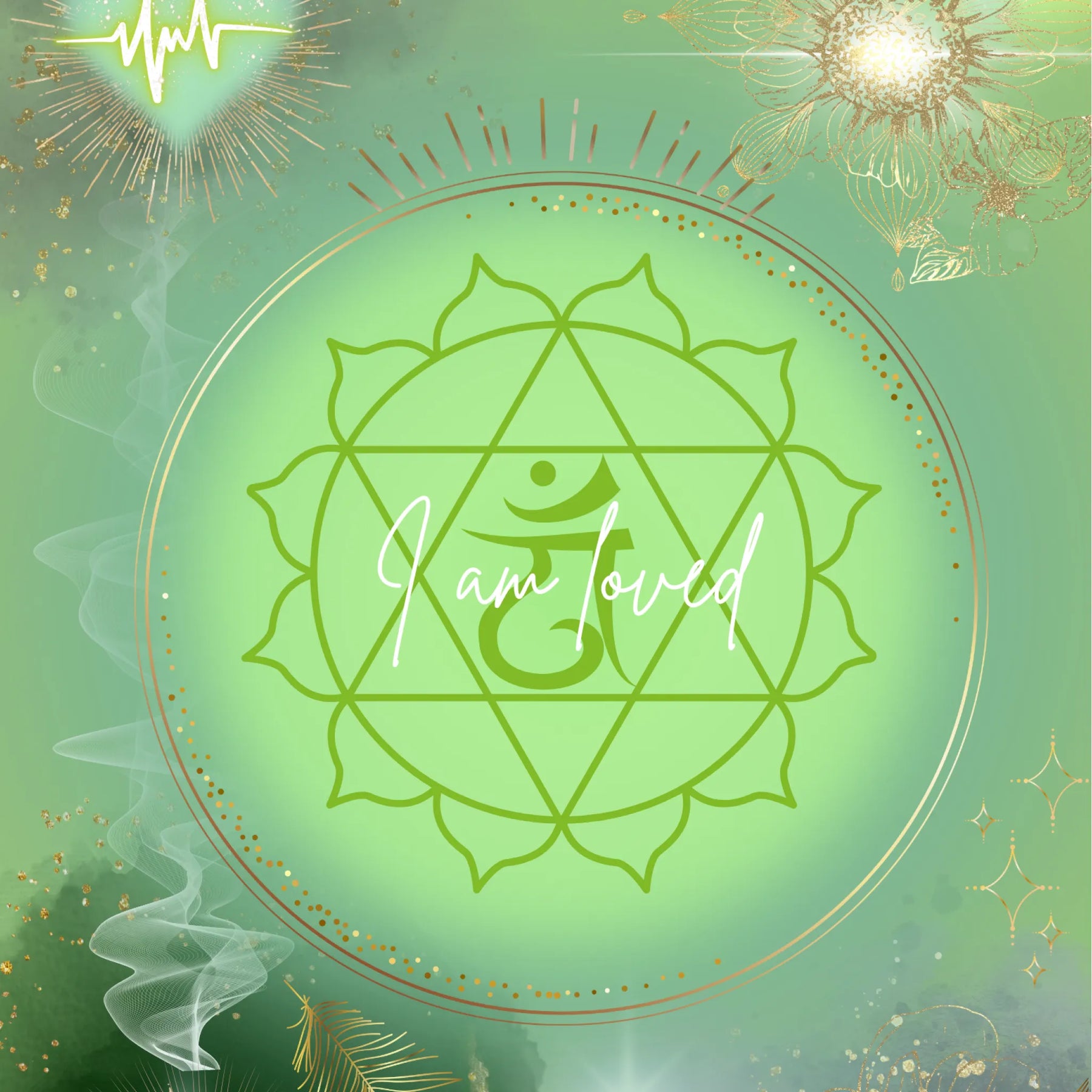 I am loved“ ist ein sanftes, heilendes Kunstwerk, das die Energie des Herzchakras in einer leuchtenden, grünen Aura zum Ausdruck bringt. Im Zentrum strahlt das klassische Symbol des Anahata-Chakras, eingebettet in ein sanft pulsierendes Lichtfeld, das Wärme, Mitgefühl und Geborgenheit ausstrahlt.