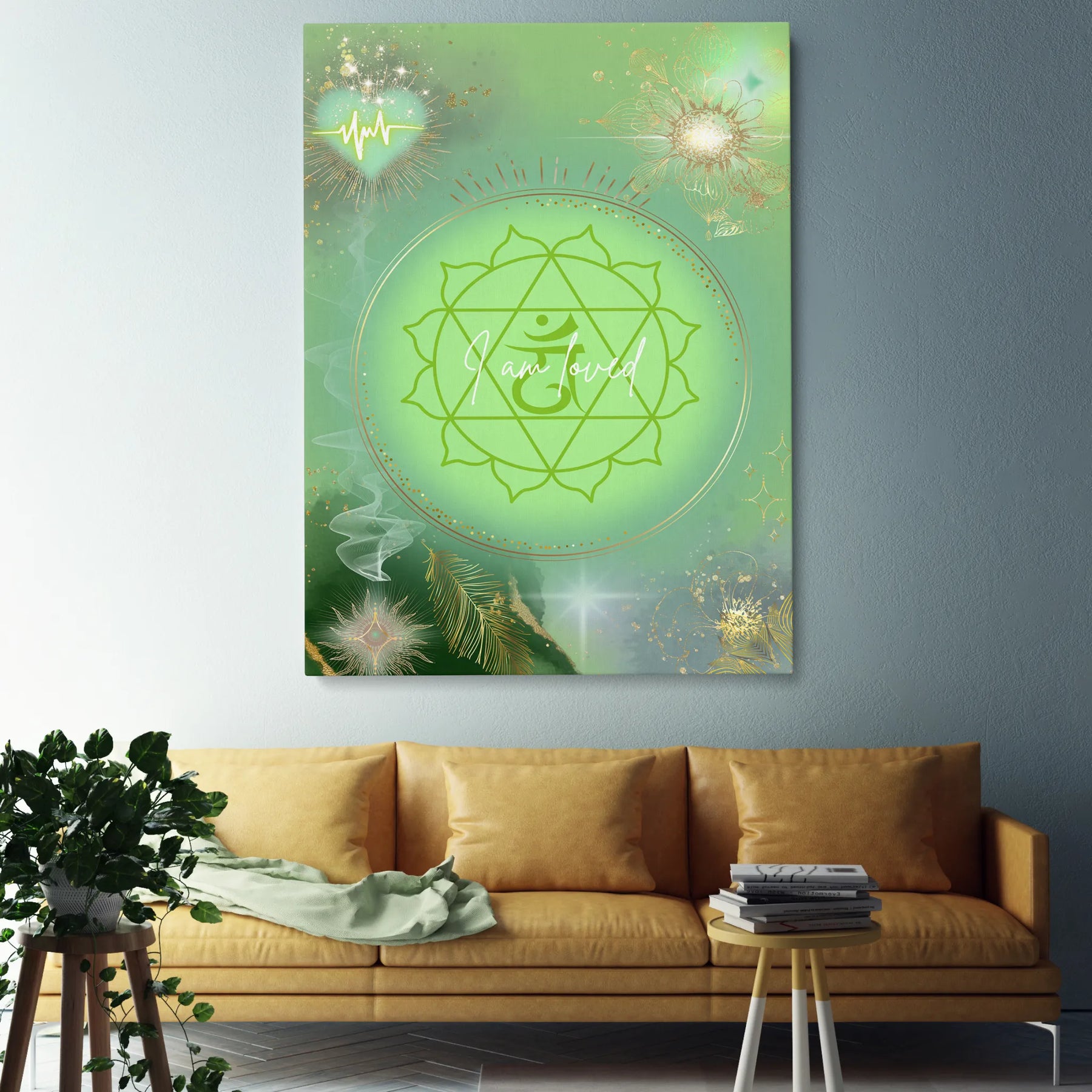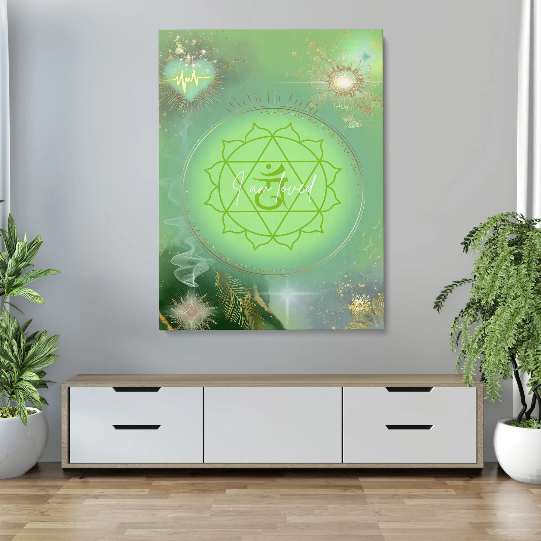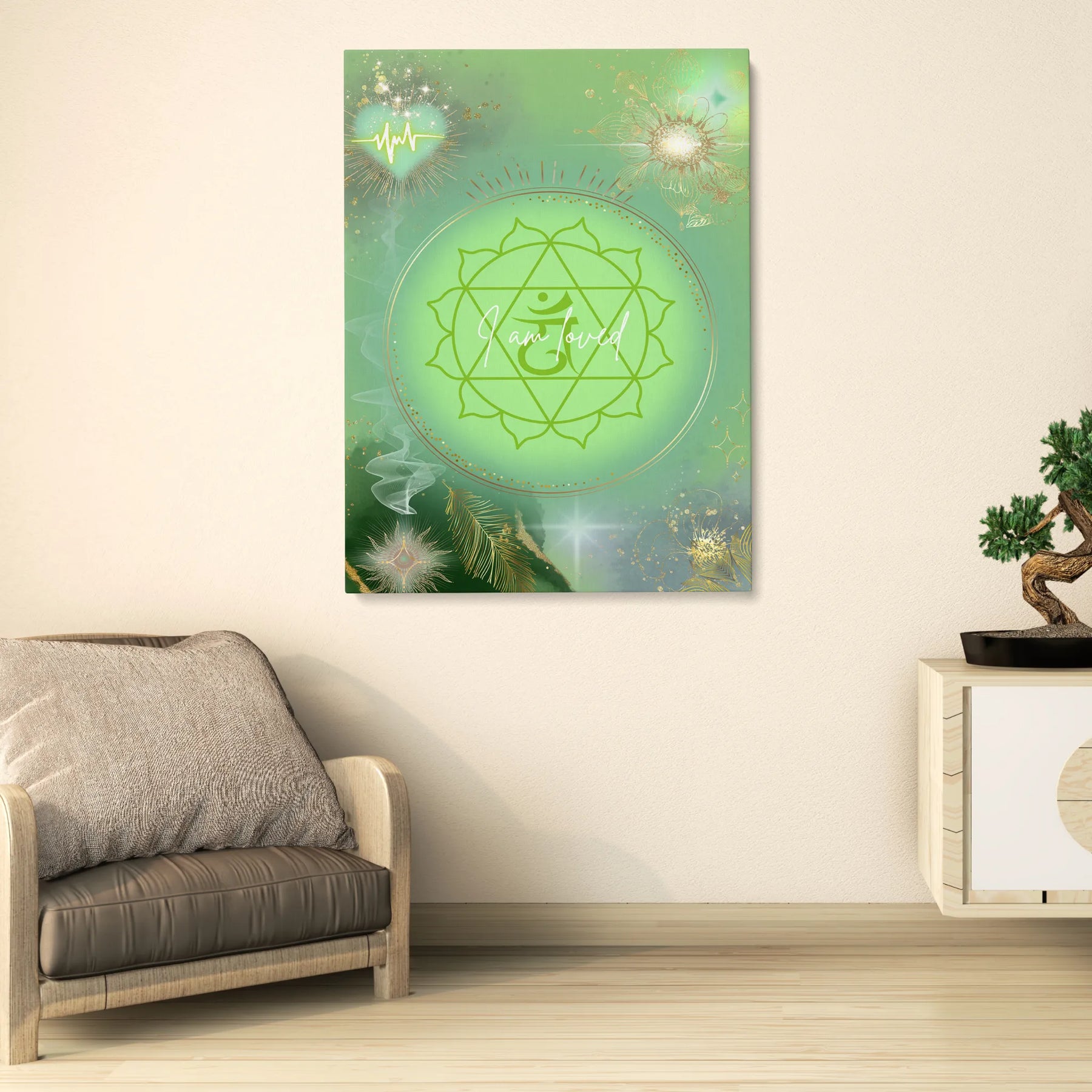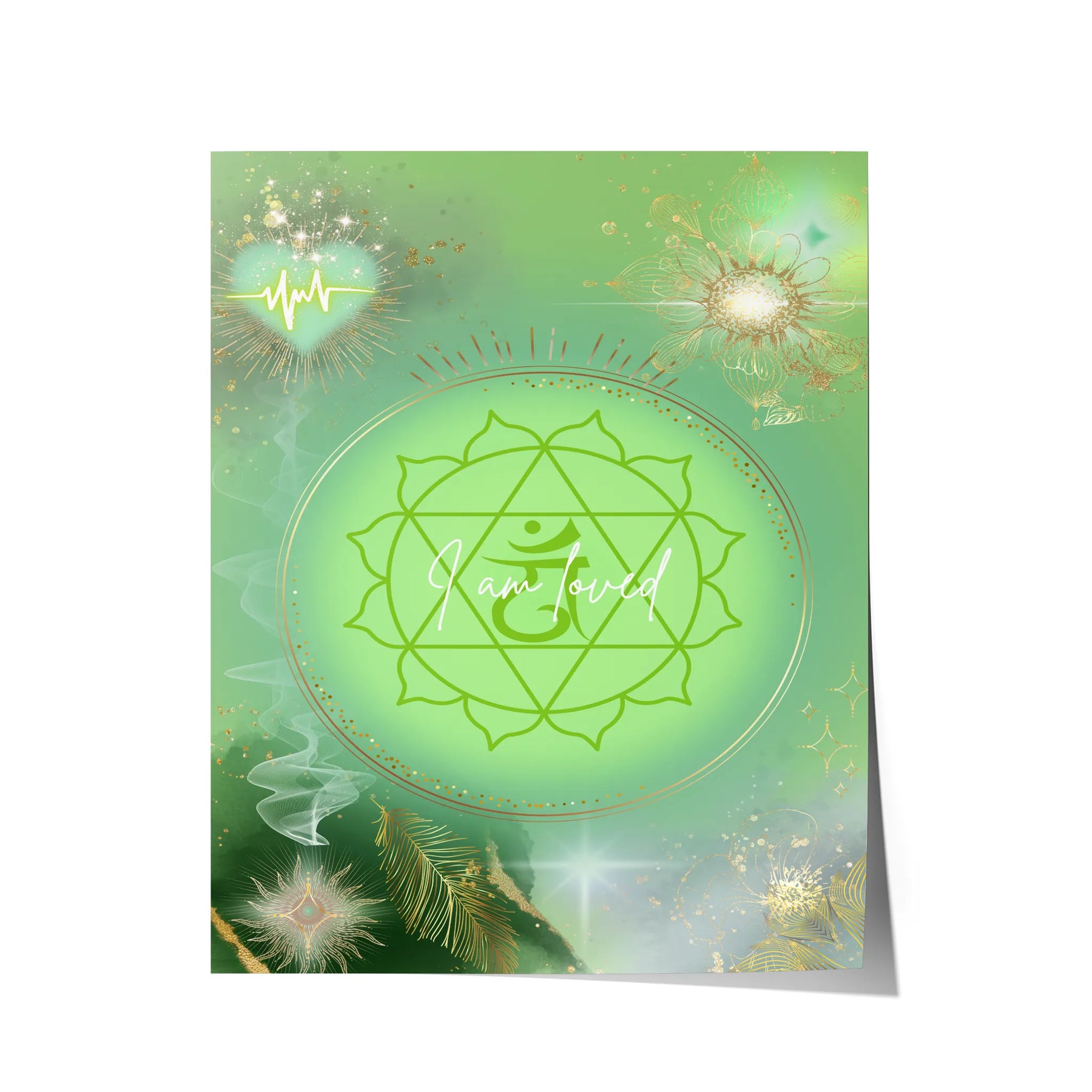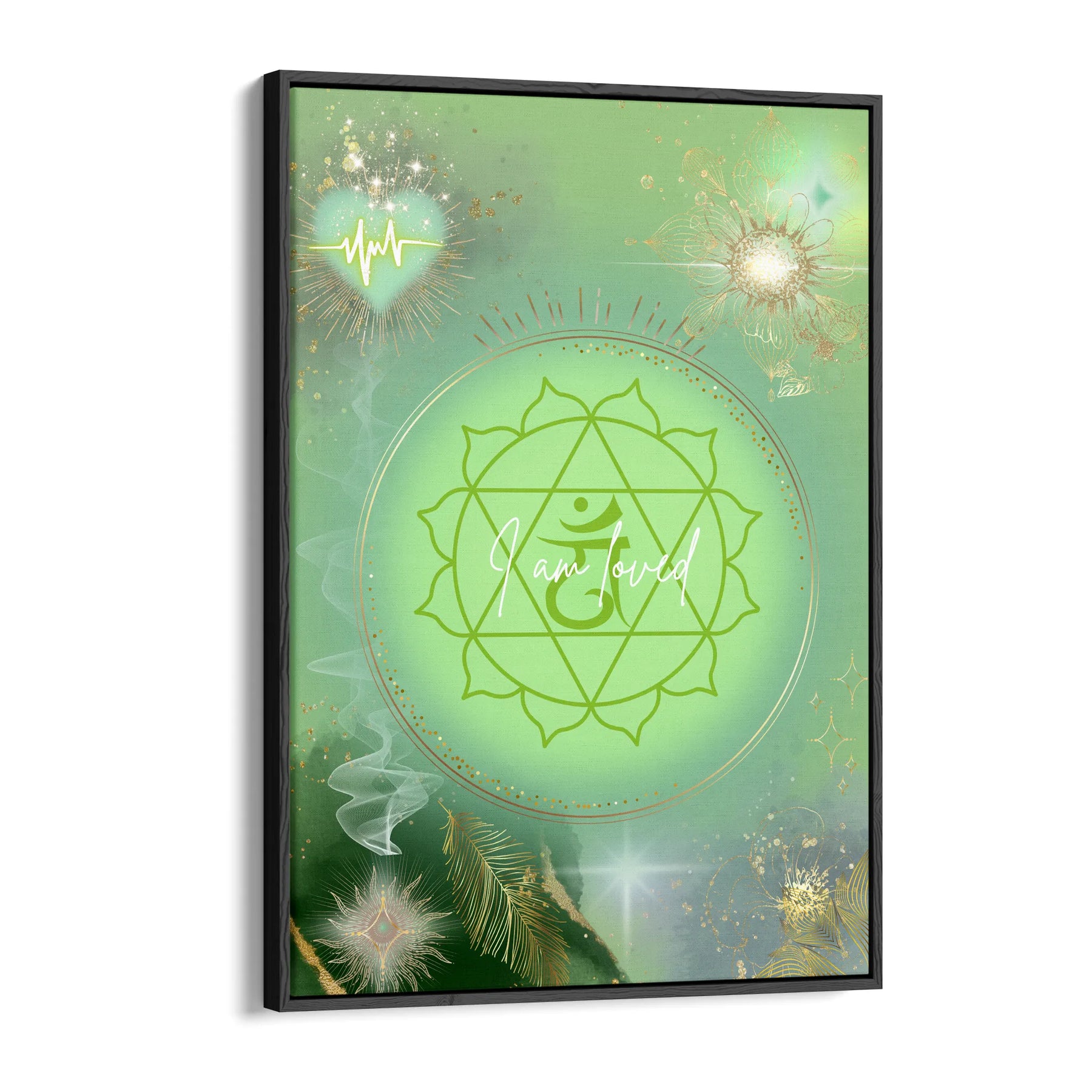 I am loved“ ist ein sanftes, heilendes Kunstwerk, das die Energie des Herzchakras in einer leuchtenden, grünen Aura zum Ausdruck bringt. Im Zentrum strahlt das klassische Symbol des Anahata-Chakras, eingebettet in ein sanft pulsierendes Lichtfeld, das Wärme, Mitgefühl und Geborgenheit ausstrahlt.