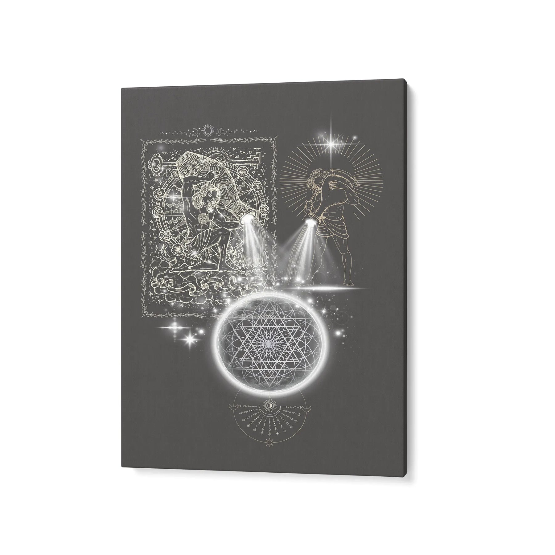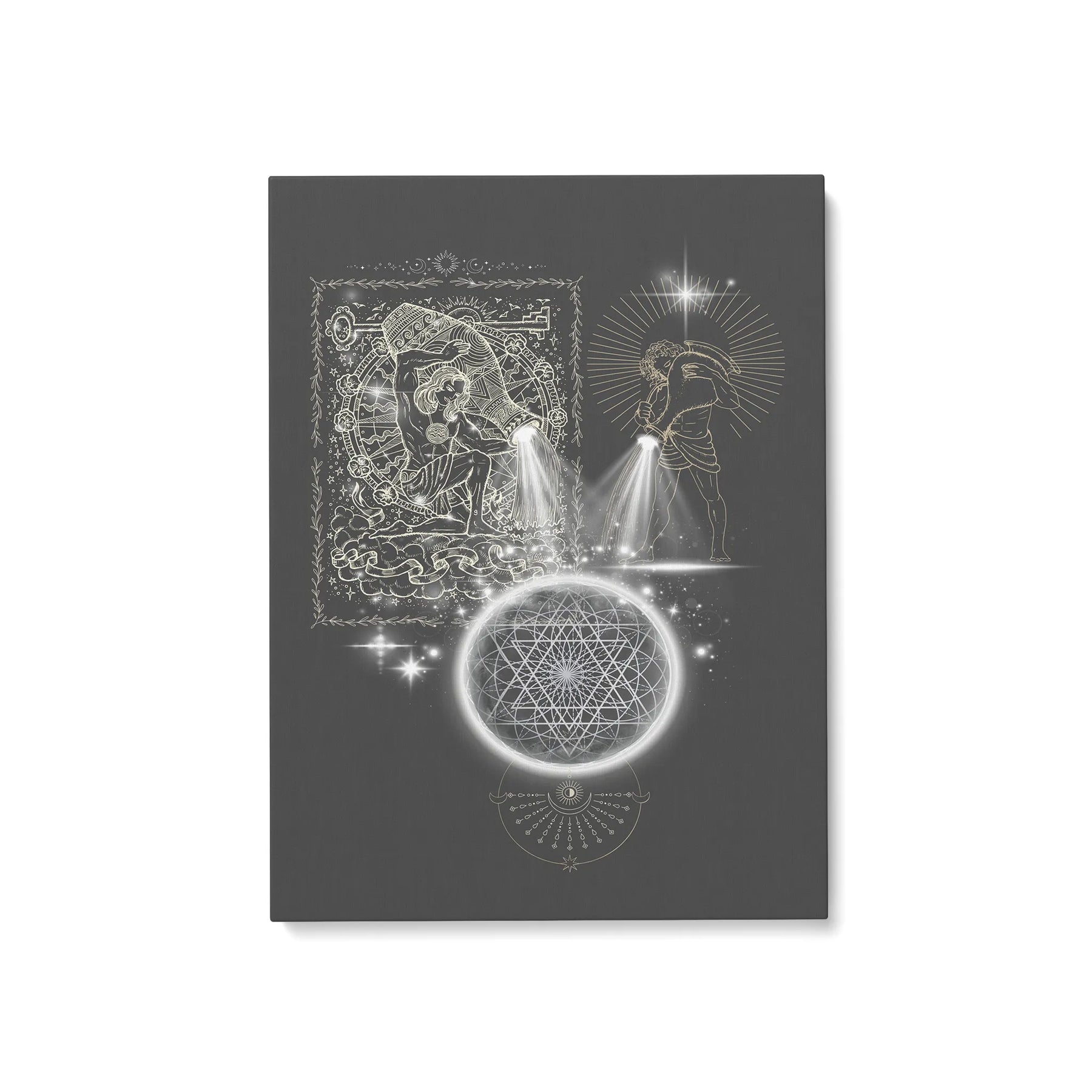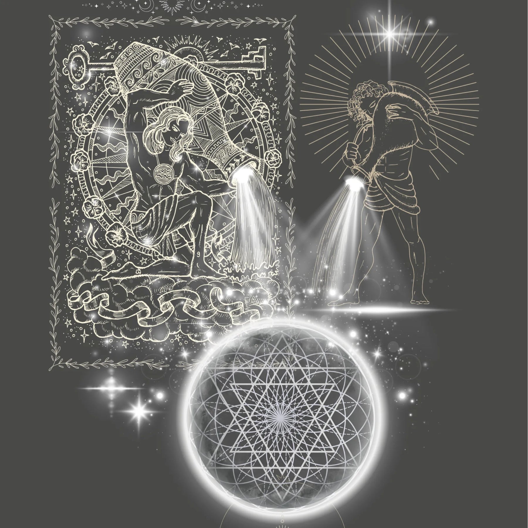 „Outpouring of Light“ zeigt eine uralte, archetypische Handlung: das bewusste Ausgießen von Licht in die Weite des Kosmos. Zwei Lichtträger stehen sich gegenüber – zeitlos, kraftvoll und jenseits jeder Kultur –, wie Träger eines alten Wissens. Aus ihren Gefäßen strömt kein Wasser, sondern reine, strahlende Essenz: Licht als Symbol für Bewusstsein, Vision und die schöpferische Kraft des Neuwerdens. Dieses Licht fließt wie ein endloser Atemzug in ein kosmisches Gefüge aus heiliger Geometrie, ein Netz, das die unsichtbaren Gesetzmäßigkeiten des Universums trägt. Im Zentrum leuchtet ein Sternpunkt wie ein Knoten zwischen Welten – dort, wo Idee zu Energie wird, Vision zu Form und das Ungeformte Gestalt annimmt.