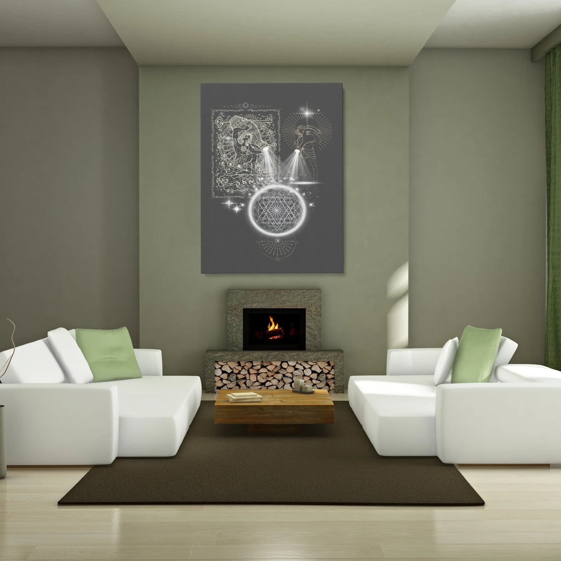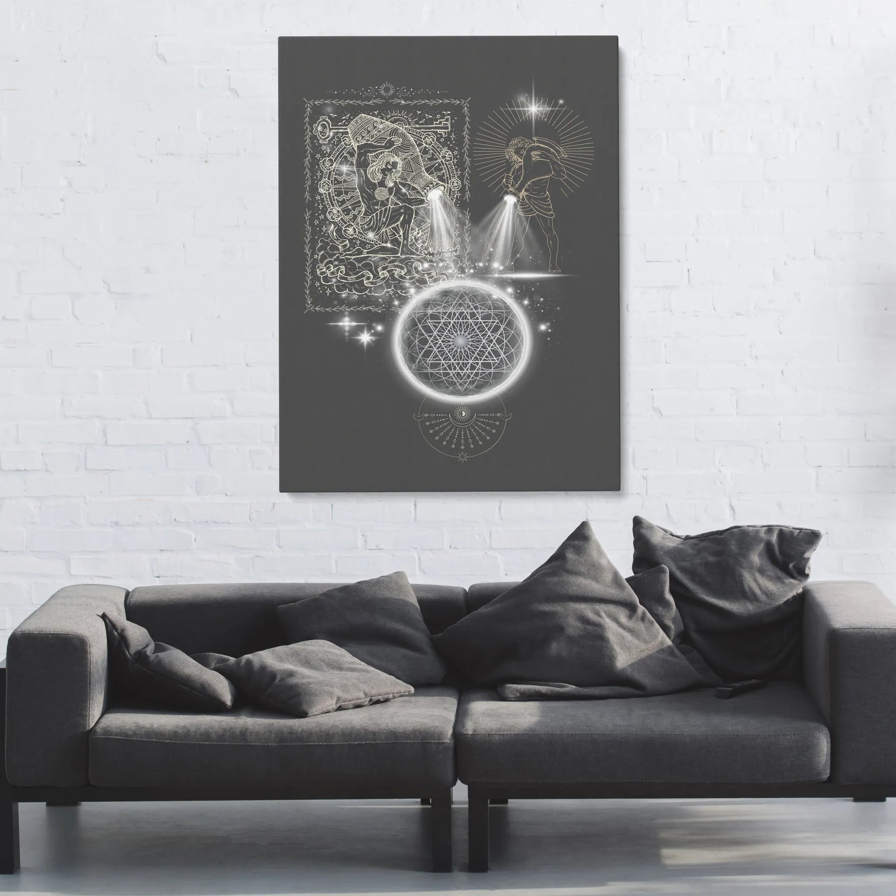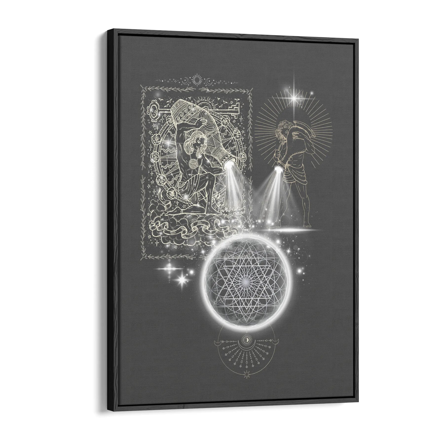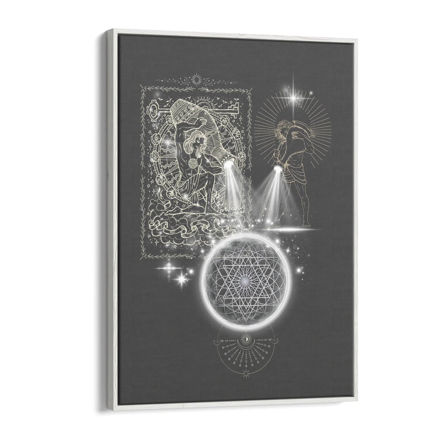 „Outpouring of Light“ zeigt eine uralte, archetypische Handlung: das bewusste Ausgießen von Licht in die Weite des Kosmos. Zwei Lichtträger stehen sich gegenüber – zeitlos, kraftvoll und jenseits jeder Kultur –, wie Träger eines alten Wissens. Aus ihren Gefäßen strömt kein Wasser, sondern reine, strahlende Essenz: Licht als Symbol für Bewusstsein, Vision und die schöpferische Kraft des Neuwerdens. Dieses Licht fließt wie ein endloser Atemzug in ein kosmisches Gefüge aus heiliger Geometrie, ein Netz, das die unsichtbaren Gesetzmäßigkeiten des Universums trägt. Im Zentrum leuchtet ein Sternpunkt wie ein Knoten zwischen Welten – dort, wo Idee zu Energie wird, Vision zu Form und das Ungeformte Gestalt annimmt.