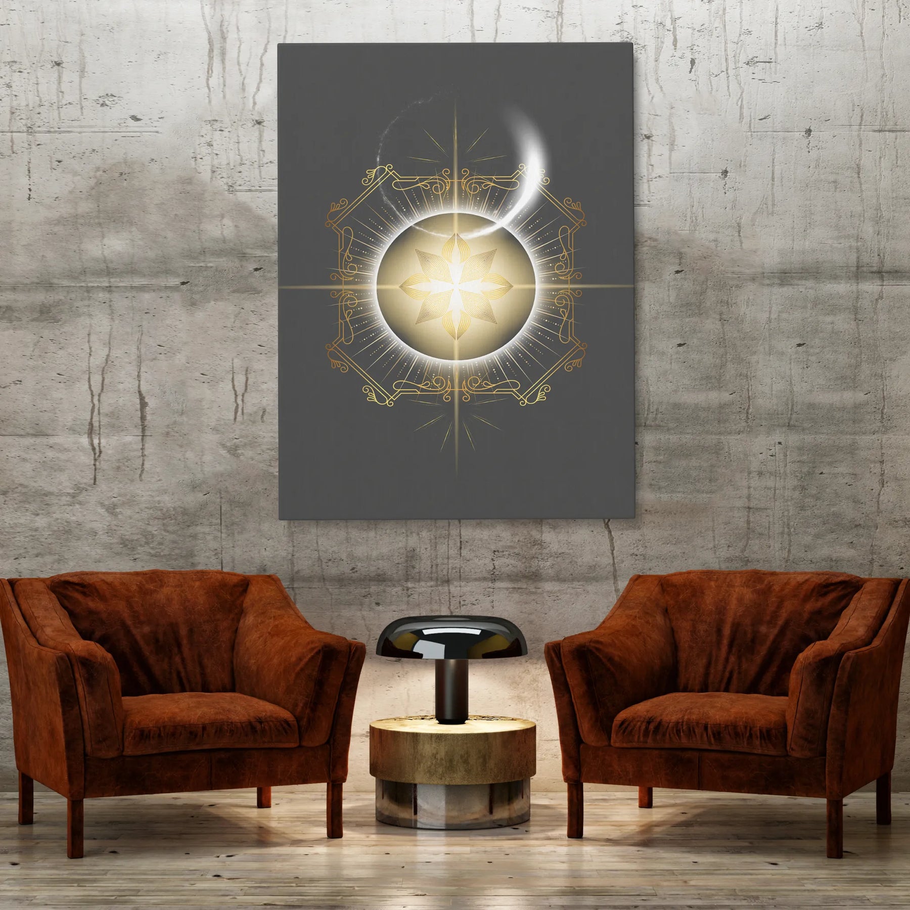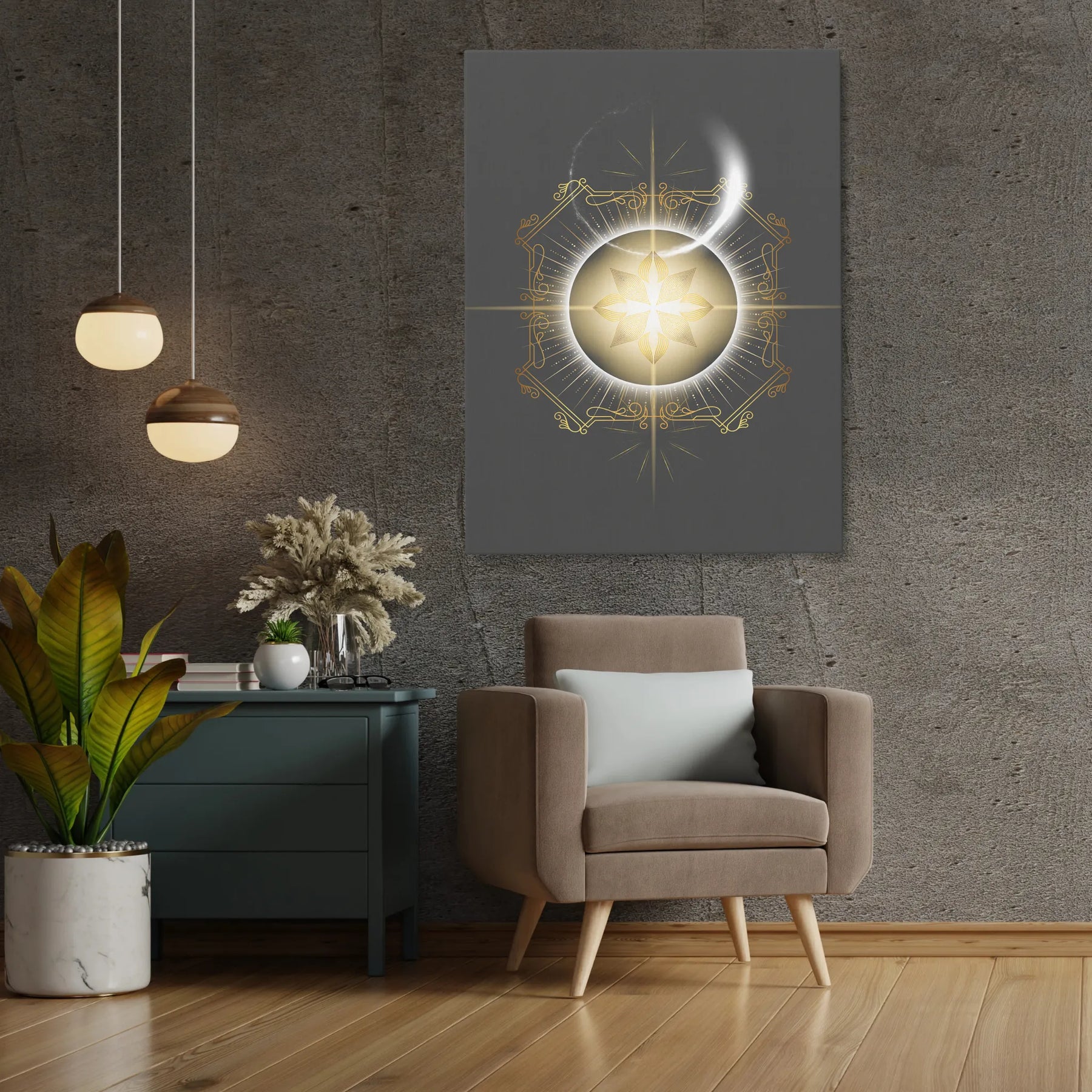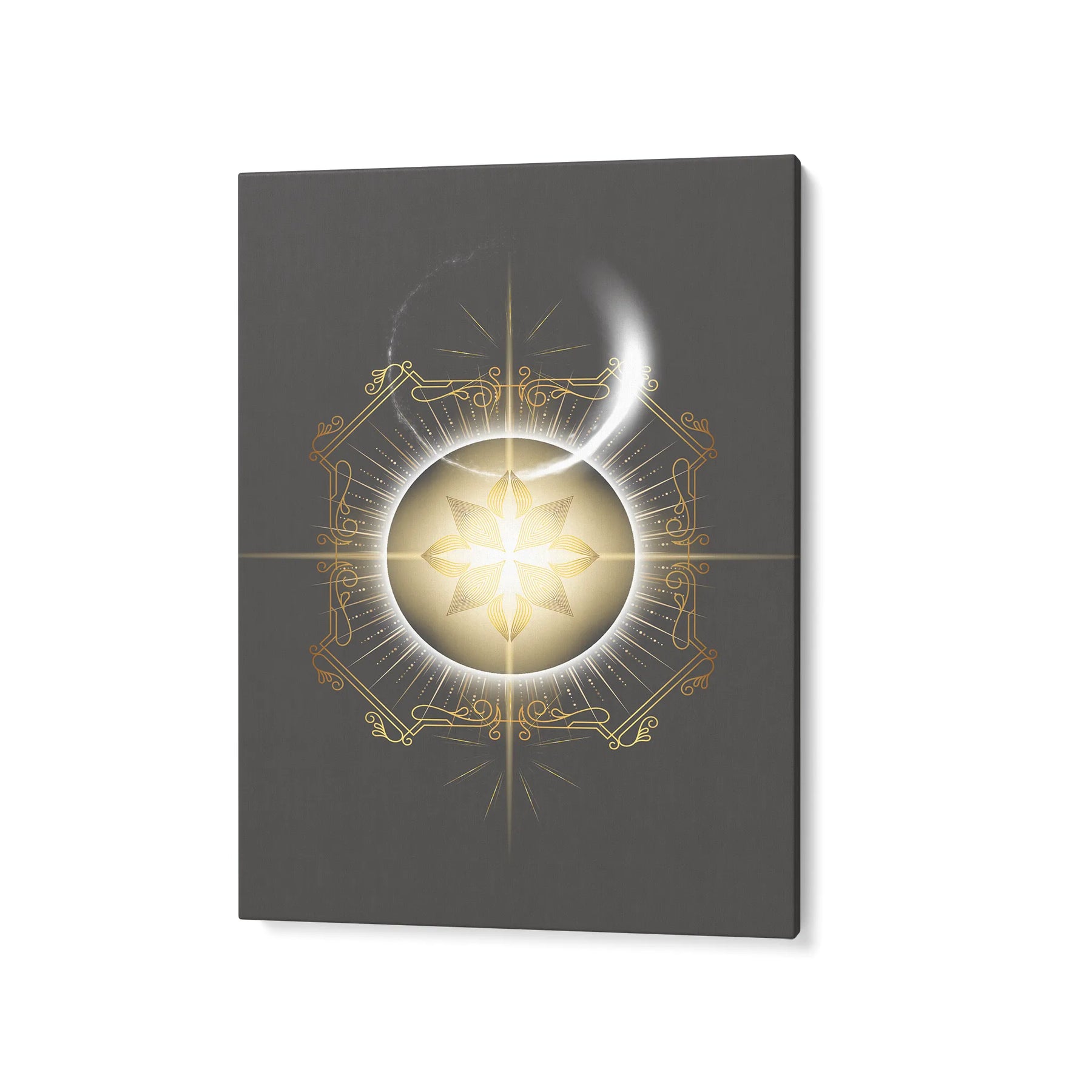 "Radiance of Genesis" zeigt ein strahlendes Zentrum aus Gold und Weiß – ein Symbol für Ursprung, Klarheit und schöpferische Kraft. Die feinen geometrischen Linien, die elegante Goldverzierung und der leuchtende Kern verbinden sich zu einem Motiv, das Ruhe, Fokus und eine tiefe innere Ausrichtung vermittelt. Es wirkt wie der Moment, in dem Licht Form annimmt – die stille Essenz, aus der Inspiration, Bewusstsein und neue Wege entstehen. Perfekt für Menschen, die in ihrem Raum eine Atmosphäre von Reinheit, Präsenz und energetischer Klarheit schaffen möchten.