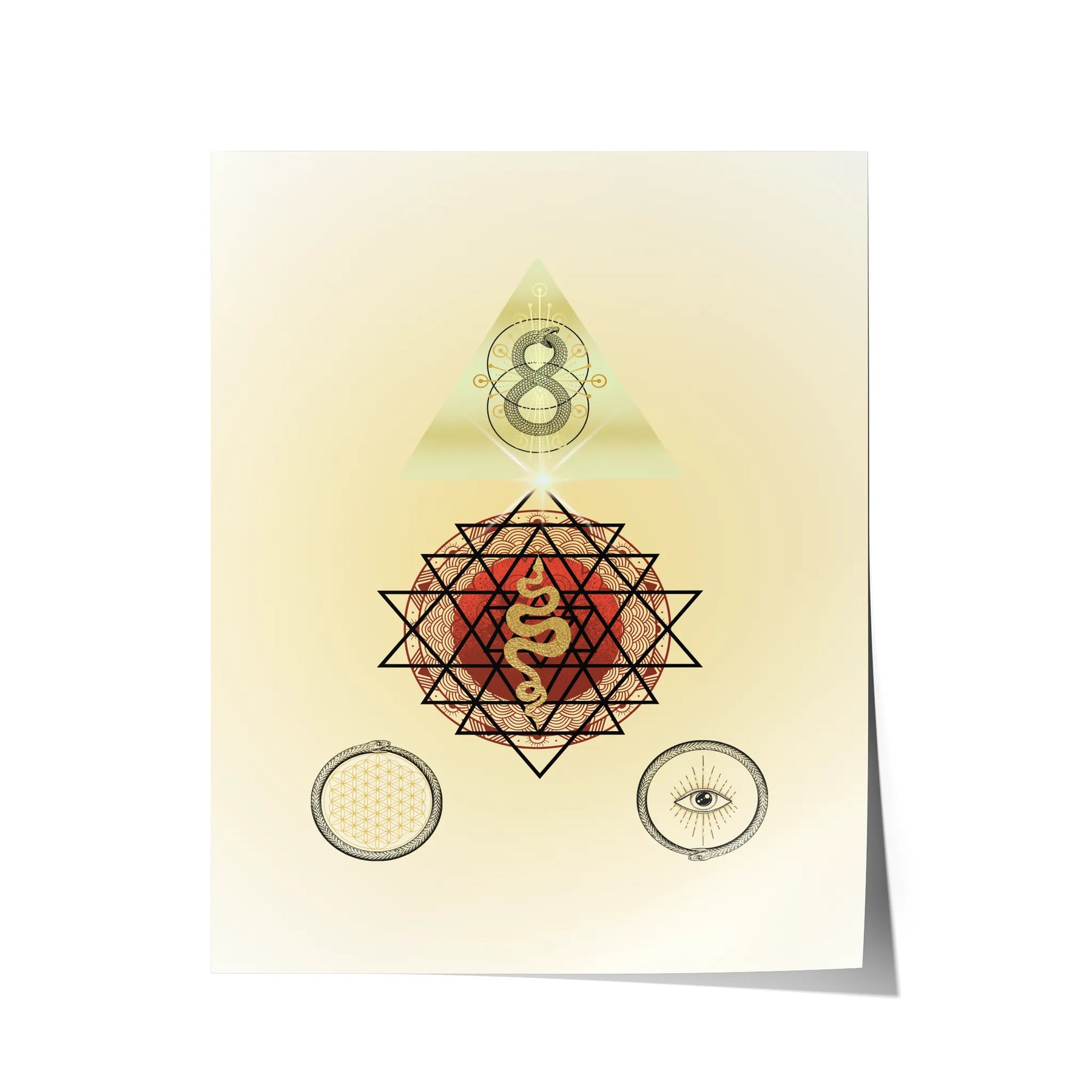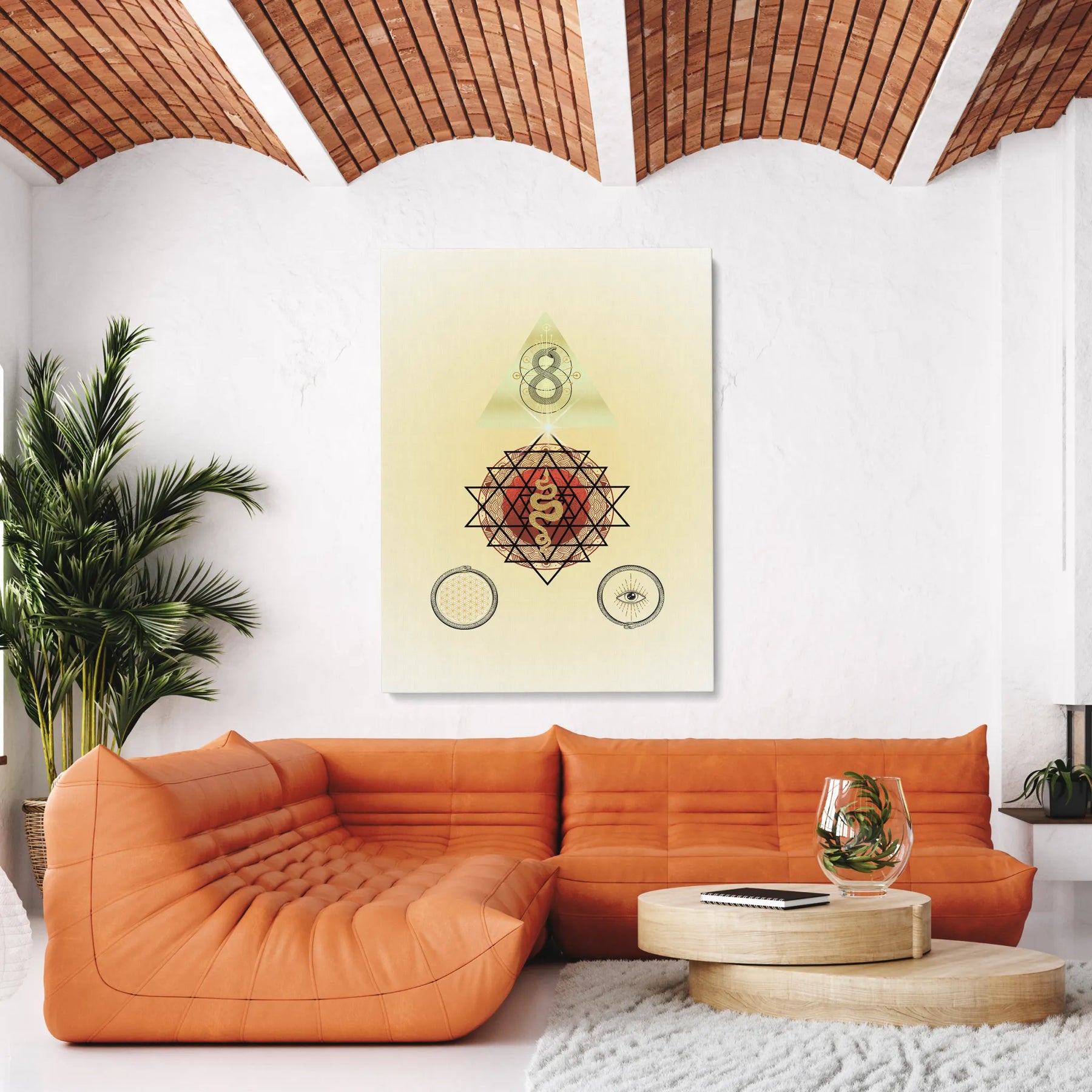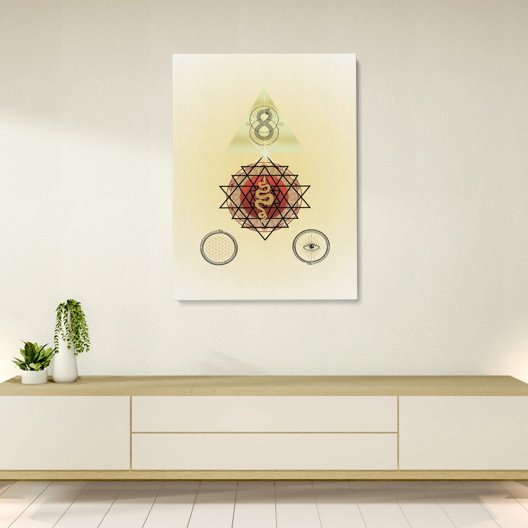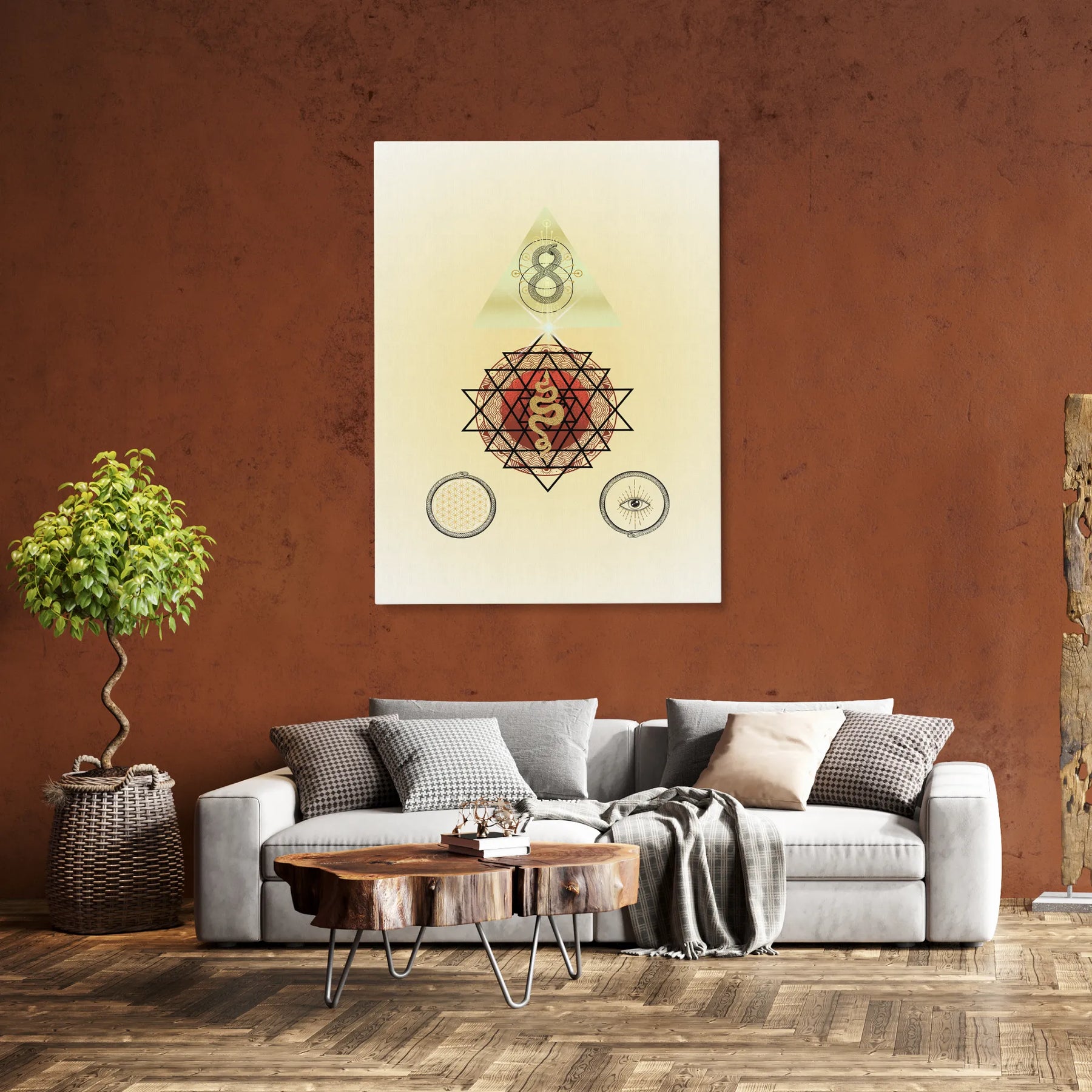 Dieses Wandbild vereint mystische Symbolik mit moderner Ästhetik. Im Zentrum steht eine goldene Schlange, eingebettet in ein komplexes geometrisches Muster aus sich überschneidenden Dreiecken – inspiriert vom Sri Yantra. Darüber erhebt sich ein leuchtendes Dreieck mit der Darstellung des Ouroboros, dem uralten Symbol für Unendlichkeit und ewige Erneuerung. Unten ergänzen zwei Kreise das harmonische Gesamtbild: einer mit dem „Auge des Bewusstseins“, der andere mit der „Blume des Lebens“.