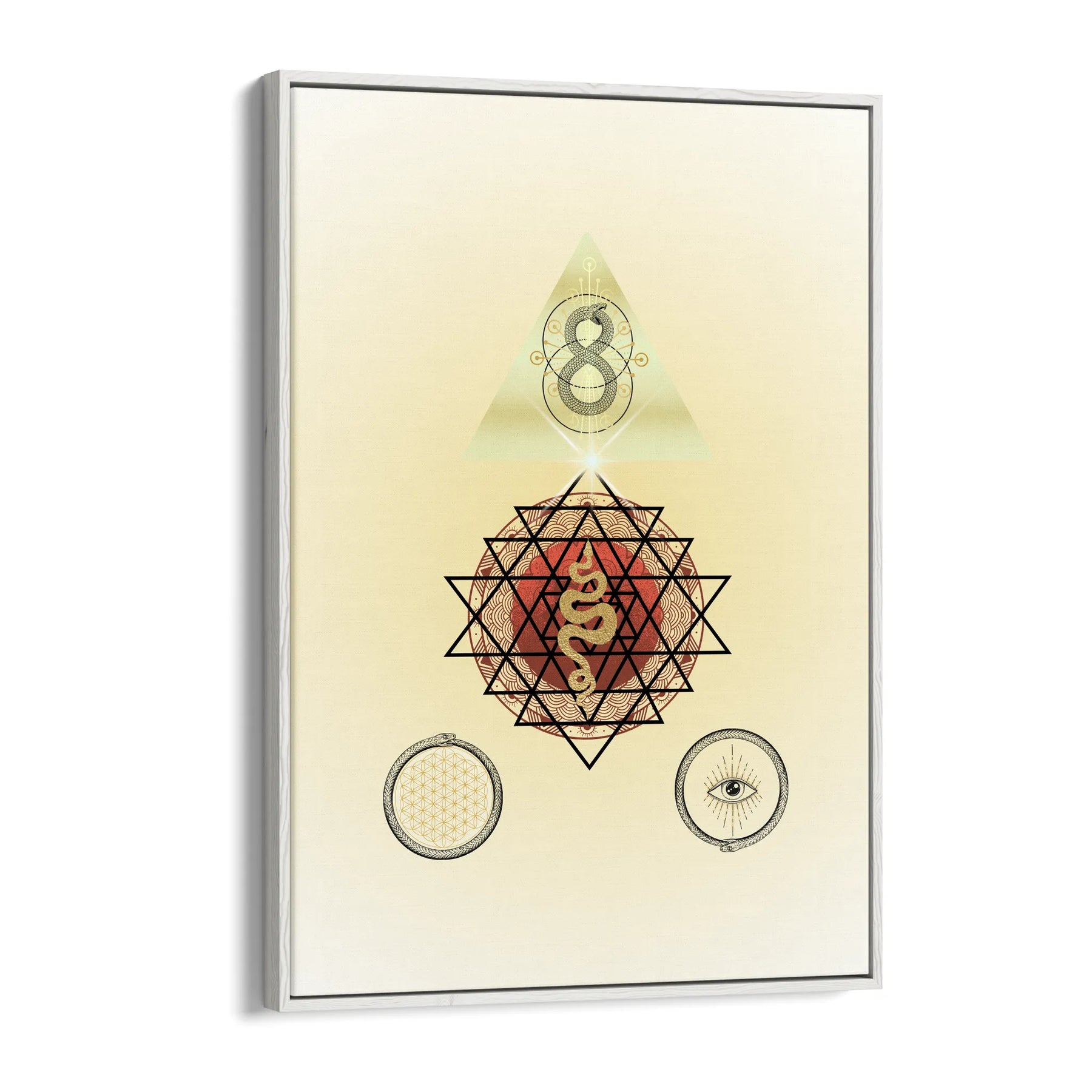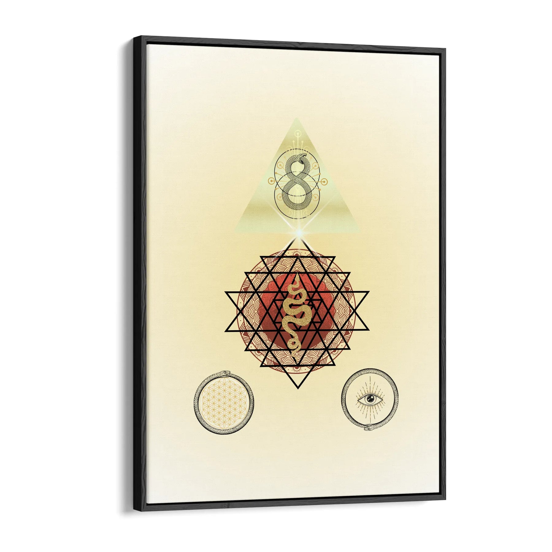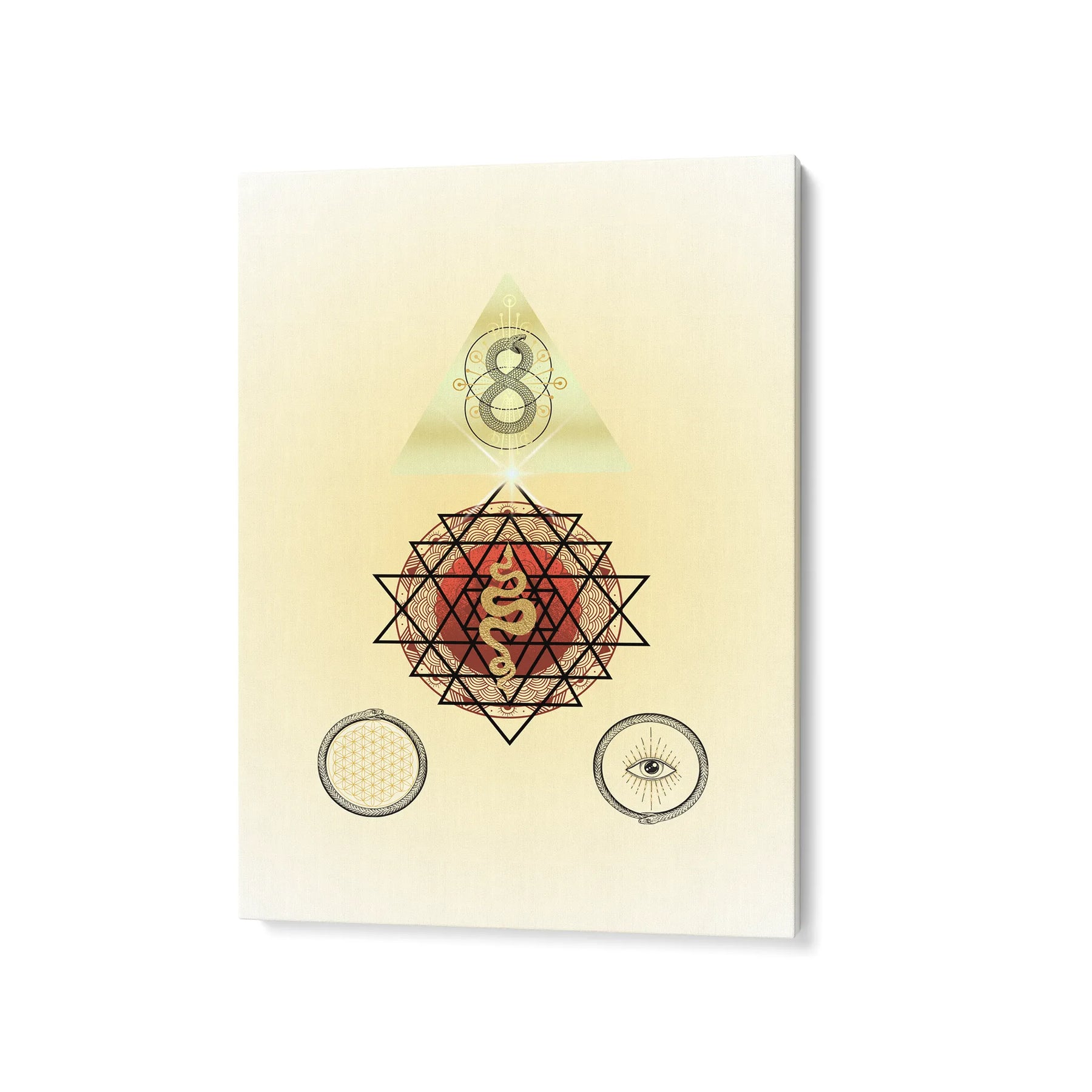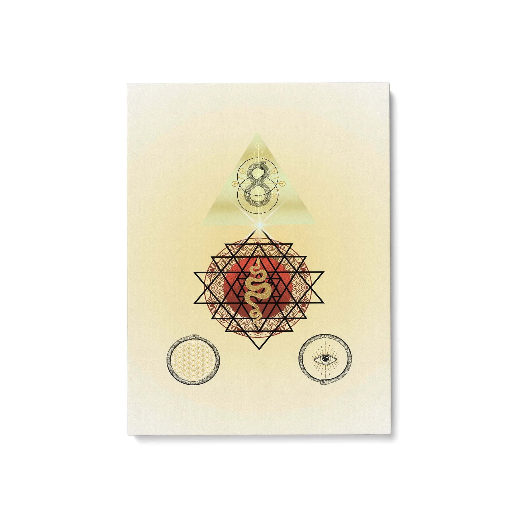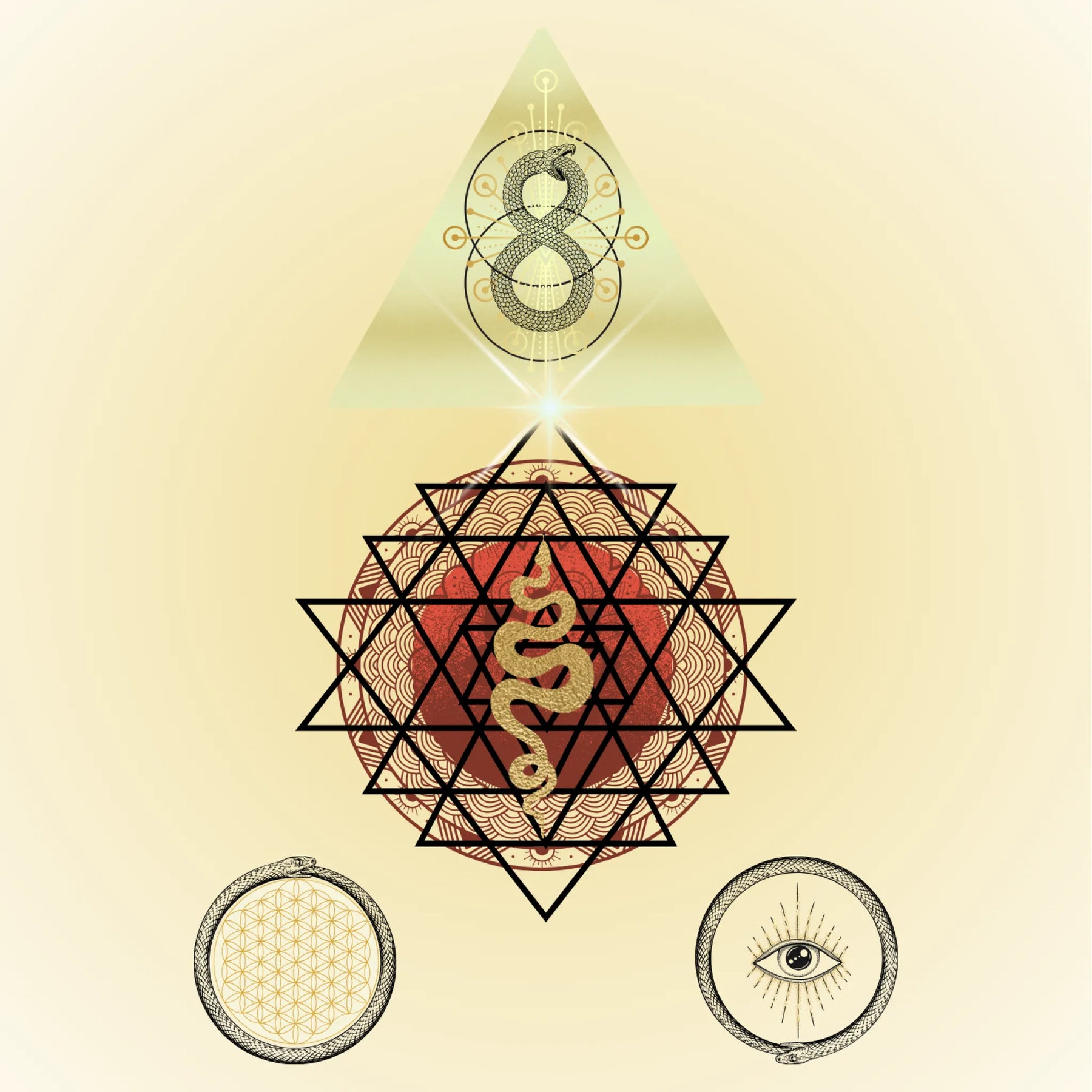 Dieses Wandbild vereint mystische Symbolik mit moderner Ästhetik. Im Zentrum steht eine goldene Schlange, eingebettet in ein komplexes geometrisches Muster aus sich überschneidenden Dreiecken – inspiriert vom Sri Yantra. Darüber erhebt sich ein leuchtendes Dreieck mit der Darstellung des Ouroboros, dem uralten Symbol für Unendlichkeit und ewige Erneuerung. Unten ergänzen zwei Kreise das harmonische Gesamtbild: einer mit dem „Auge des Bewusstseins“, der andere mit der „Blume des Lebens“.